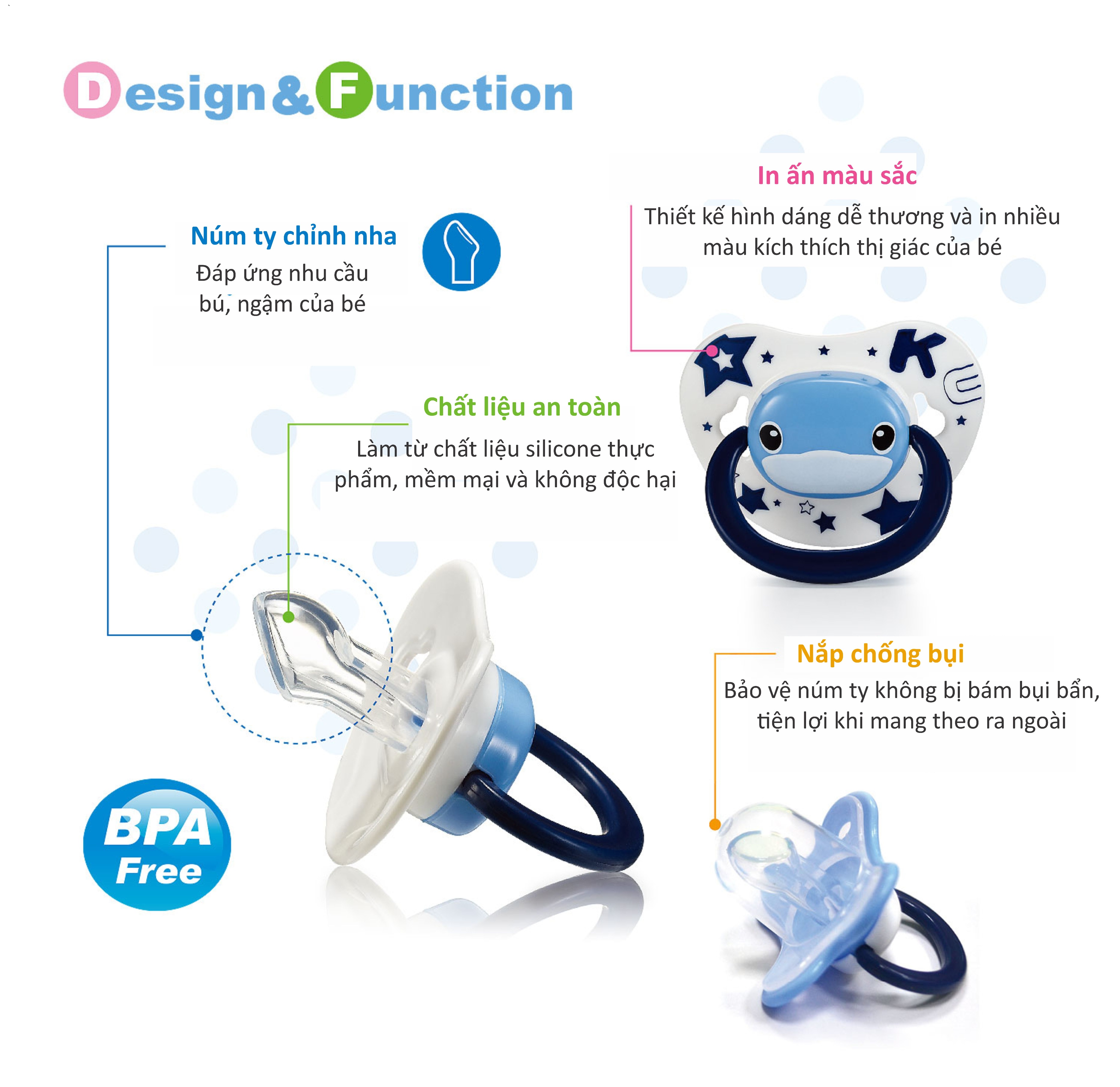 Dỗ bé bú sữa ngay từ khi sinh ra Vừa vặn, ngay cả vào ban đêm Có nút phát sáng trong bóng tối Thiết kế theo cấu trúc vòm miệng và không chứa BPA 1