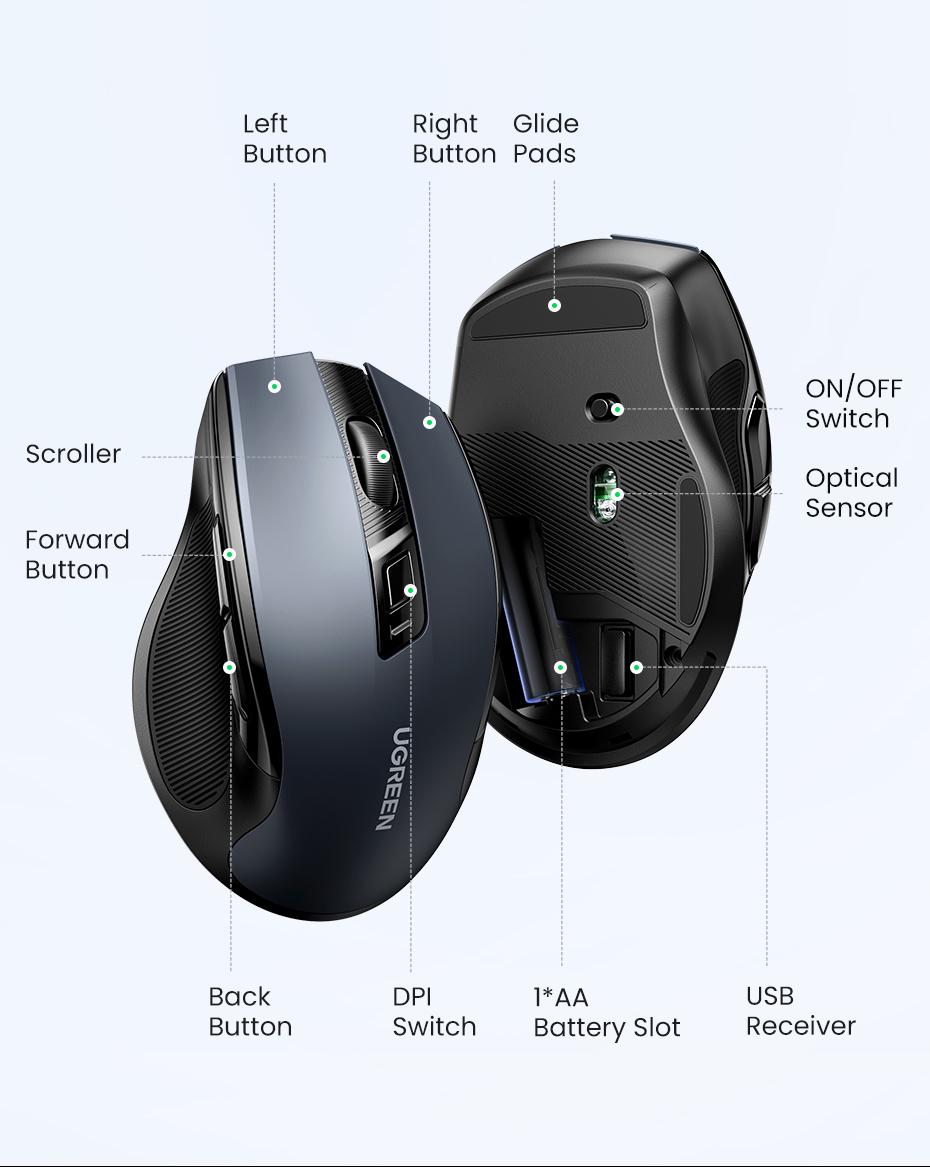 1. Brand: UGreen 2. Product name: Wireless mouse 3. Model: MU105 4. Color : Midnight Blue 5. Connection method: 2.4G wireless (USB receiver) 6. Working distance: 10 meters 7. Sensitivity: 800/1200/1600/2400 (four gears) 8. Return