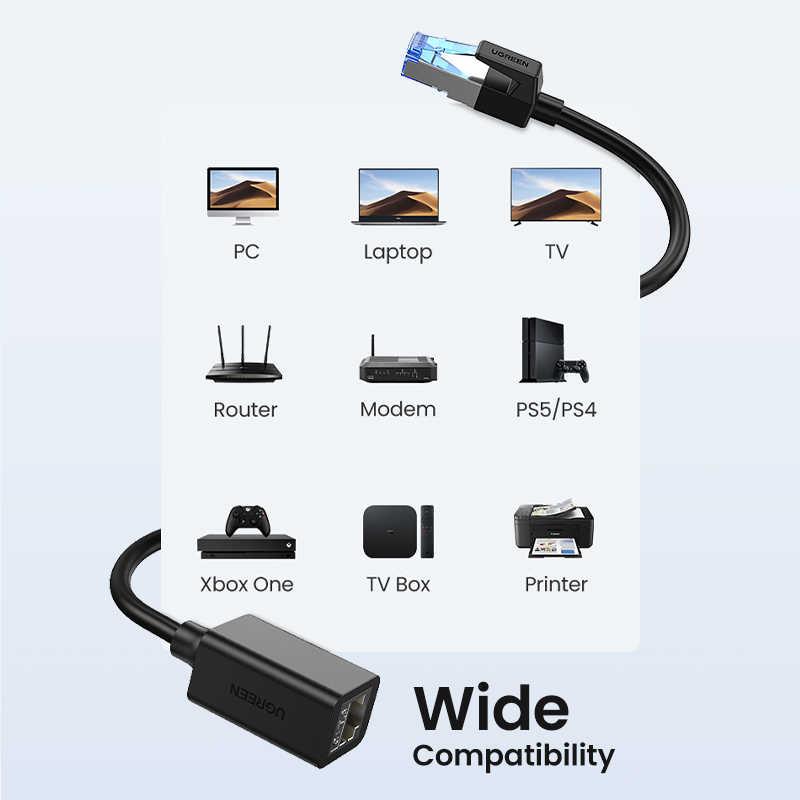 Cáp nối dài mạng LAN CAT 8 dài 1m Ugreen 50199 có thể tương thích hoàn hảo với máy tính, máy tính xách tay, modem, bộ định tuyến, PS5, PS4, PS3, X-Box 360, X-Box One, thiết bị chuyển mạch mạng, ADSL, bộ điều hợp mạng, trung tâm và các mạng khác thiết bị có đầu nối RJ45. Nó cũng có thể hoàn toàn tương thích ngược với Cat7, Cat6e, Cat6, Cat5e, Cat5.