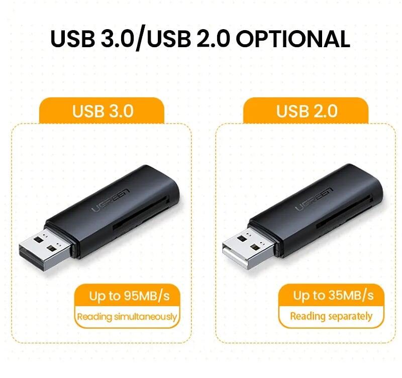 Ugreen 40753 usb 3.0 to tf + sd card readerdual card dual read white cm104 1. Input : USB 3.0 A Male 2. USB 3.0 and compatible with USB2.0 speeds up to 5Gbps 3. Output