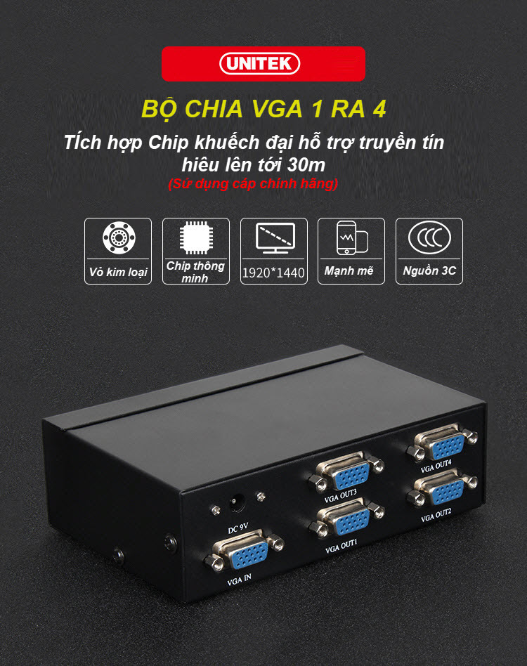 Unitek U8707 - 01 Bộ Chia VGA Unitek 1 ra 4 Hỗ Trợ Độ Phân Giải 1920*1440 @60Hz Khoảng Cách Truyền Xa Lên Tới 30m - Kèm Nguồn AnZ - Hàng Chính Hãng Hỗ trợ