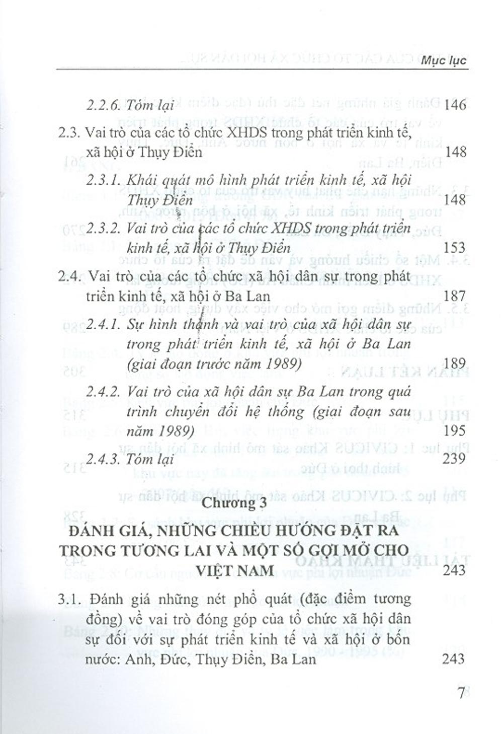 Chương 1: Những cơ sở nền tảng của các tổ chức xã hội dân sự (XHDS) trong sự phát triển kinh tế và xã hội ở Liên minh Châu Âu (EU) Chương 2: Vai trò của các tổ chức xã hội dân sự trong phát triển kinh tế và xã hội ở Liên minh Châu Âu (qua nghiên cứu trường hợp bốn quốc gia Anh, Đức, Thụy Điển, Ba Lan) Chương 3: Đánh giá, những chiều hướng đặt ra trong tương lai và một số gợi mở cho Việt Nam
