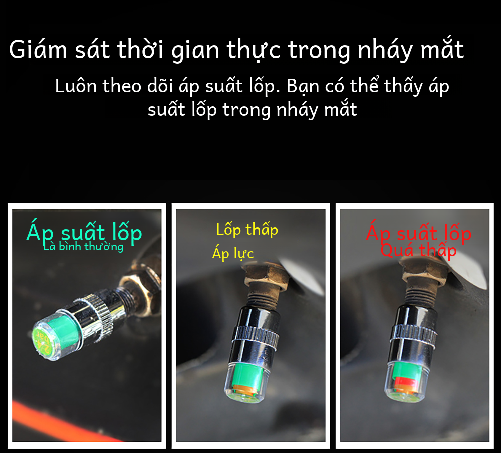 - Nó có thể đảm bảo áp suất không khí bình thường của lốp, giảm hao mòn lốp và kéo dài tuổi thọ lốp. Phù hợp với bất kỳ kích thước tiêu chuẩn hiện có Thân van lốp. Trực quan cảnh báo bạn khi áp suất lốp thấp để giúp tránh hao mòn lốp sớm hoặc thổi phồng từ lốp dưới. Các tính năng: