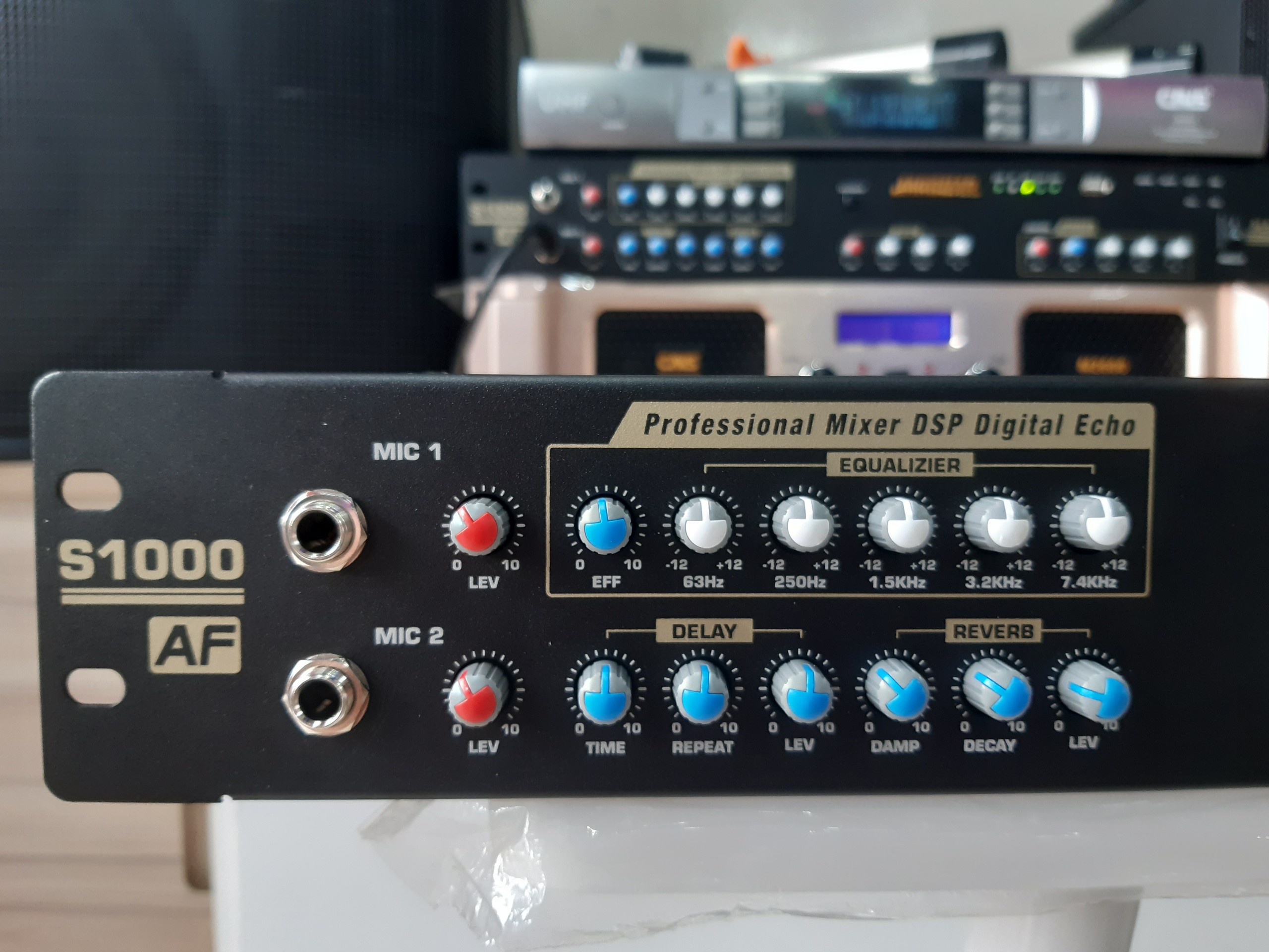 - ĐIỀU CHỈNH CHI TIẾT CÁC DẢI TẦN MIC Đây là tính năng cao cấp của vang cơ S1000 so với 2 model vang cơ S600 và vang cơ S800. Trên S1000 cho phép người dùng có thể điều chỉnh dải tần từ 50Hz đến 12kHz bằng 9 cần xoay: 50Hz, 100Hz, 200Hz, 400Hz, 800Hz, 1,6kHz, 3,2kHz, 6,4kHz, 12kHz. Các cần xoay này có thể tăng giảm 3 dải tần Bass, Mid, Trép chi tiết hơn, để phù hợp với nhiều chất giọng khác nhau. S1000 cân được mọi loại giọng hát, chỉ cần bạn biết giọng của bạn cần tăng giảm ở giải tần nào. Không hề khó với S1000 2. Delay và Reverb can thiệp được sâu hơn.