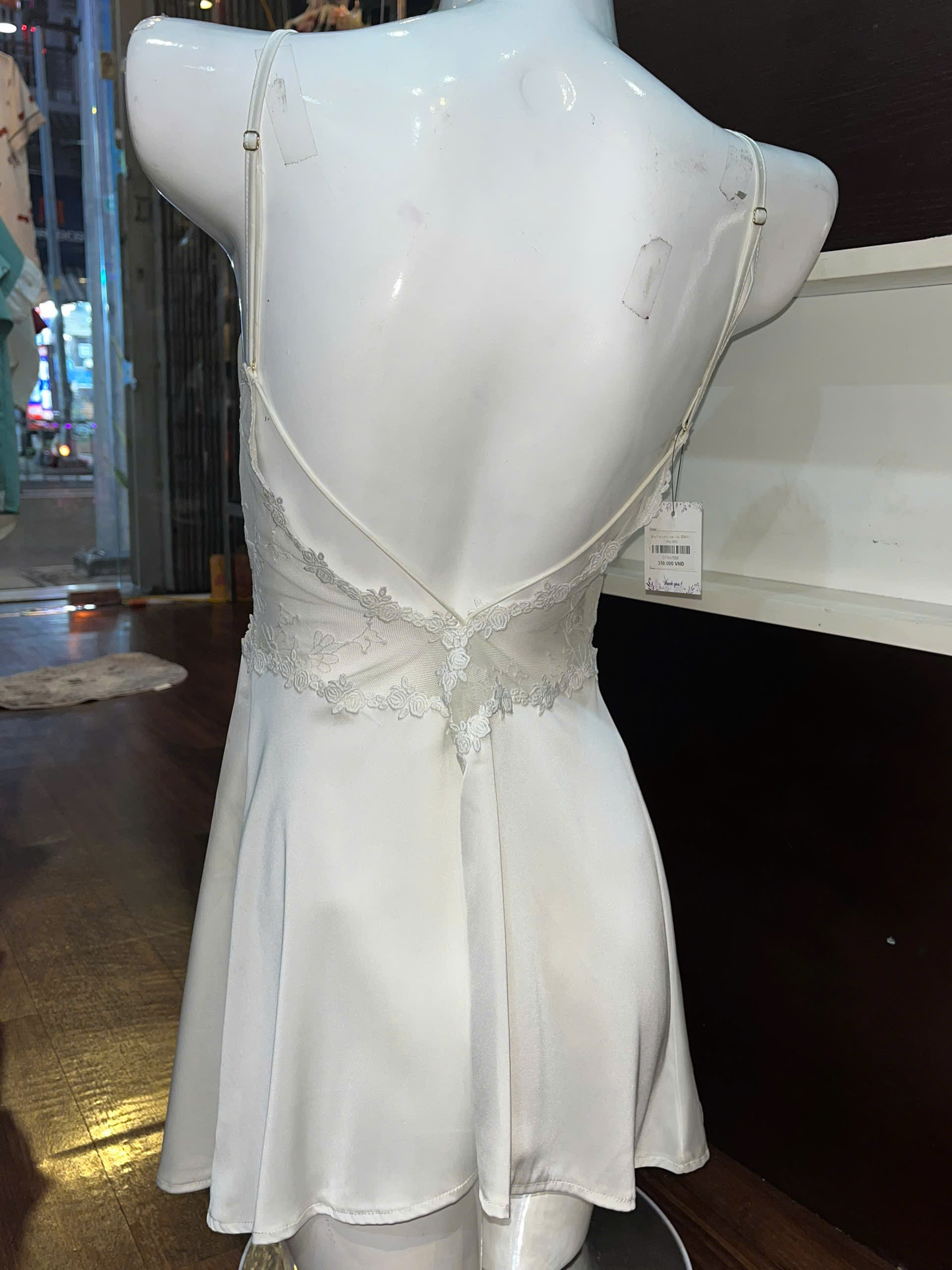 Thương hiệu: Sanny House Tên sản phẩm: Váy ngủ Chất liệu: lụa cao cấp mềm mịn, co giãn, thấm hút tốt Kiểu dáng: gợi cảm, trẻ trung, hiện đại Màu: trắng Size: dưới 56kg