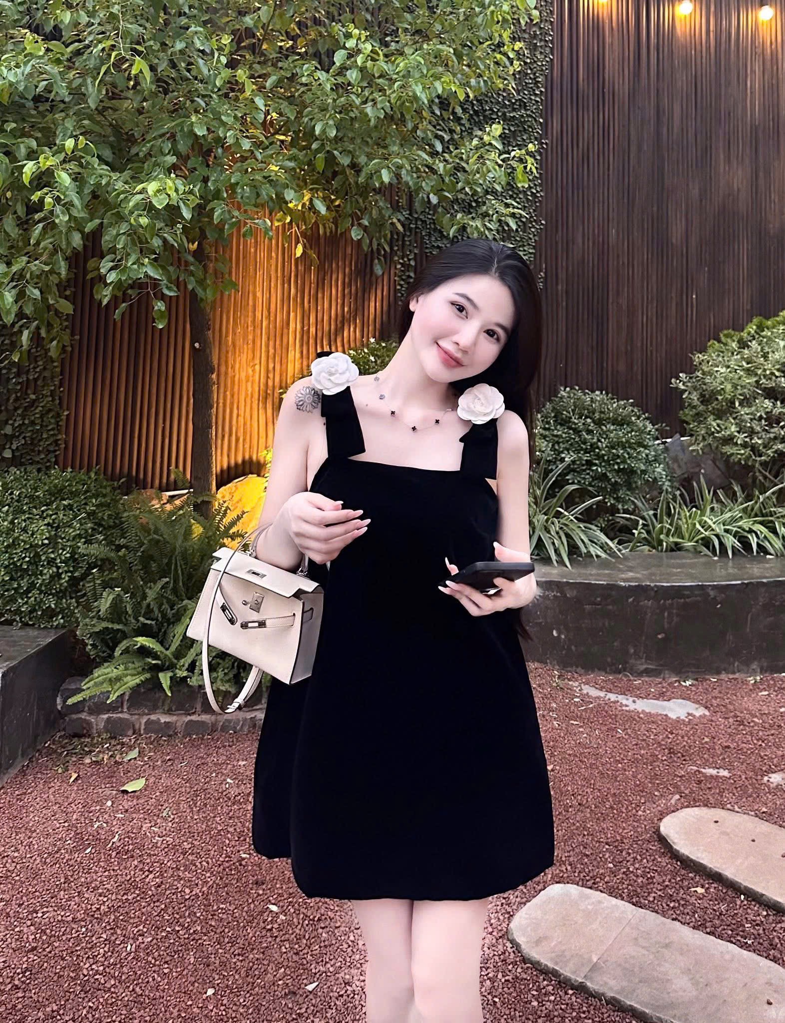 Thiết kế nổi bật: Váy nhung hai dây, quai nơ dễ thương, dáng suông thoải mái, che khuyết điểm tốt. Điểm nhấn hoa trà tinh tế, mang lại vẻ ngoài nữ tính và sang trọng.