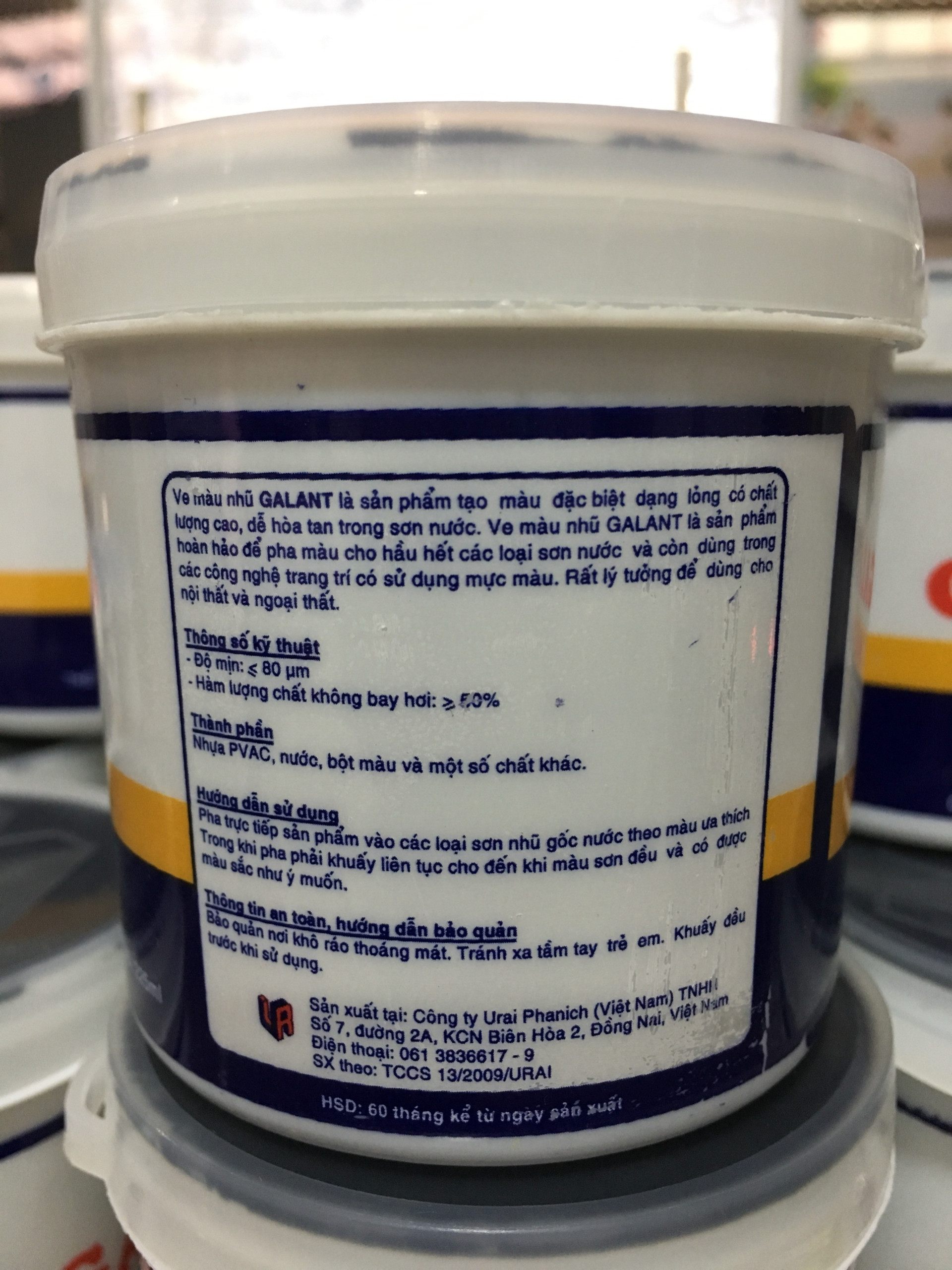 Mua tại TiktokVE MÀU VÀNG GALANT SP319 - Đơn vị tính: 1 két gồm 12 lon - Ve màu nhũ Galant là sản phẩm hoàn hảo để pha màu cho hầu hết các loại sơn nước và còn dùng trong các công nghệ trang trí có sử dụng mực màu. - Thành phần: Nhựa PVAC, nước, bột màu và một số chất khác. - Đóng gói: 225ml/lon. - Hướng dẫn sử dụng: Pha trực tiếp sản phẩm vào các loại sơn nhũ gốc nước theo màu ưa thích. Trong khi pha phải khuấy liên tục cho đến khi màu sơn đều và có được màu sắc như ý muốn. Sản phẩm được phân phối bởi: Công ty TNHH Lộc Nam Việt 1933, QL51, Phước Tân, Biên Hòa, Đồng Nai '0948 79 5588'