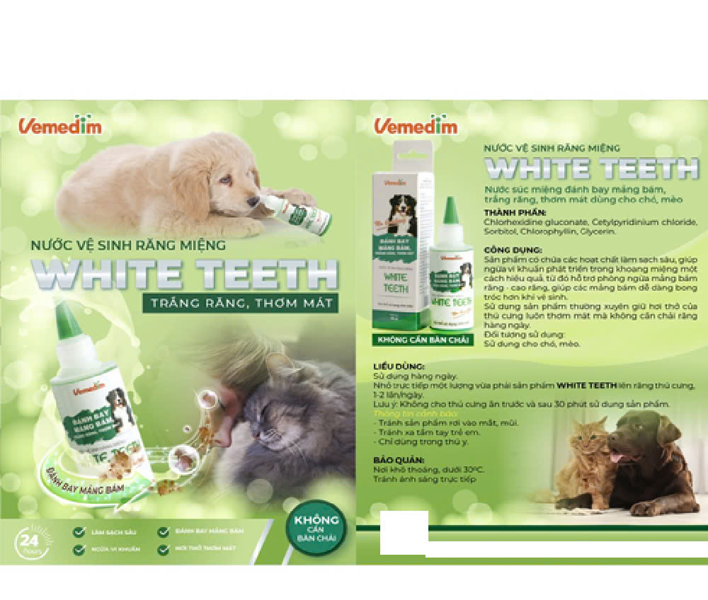 Vemedim WHITE TEETH - Nước súc miệng đánh bay mảng bám, trắng răng, thơm mát dùng cho chó, mèo THÀNH PHẦN: Chlorhexidine gluconate, Cetylpyridinium chloride, Sorbitol, Chlorophyllin, Glycerin. CÔNG DỤNG: - Sản phẩm có chứa