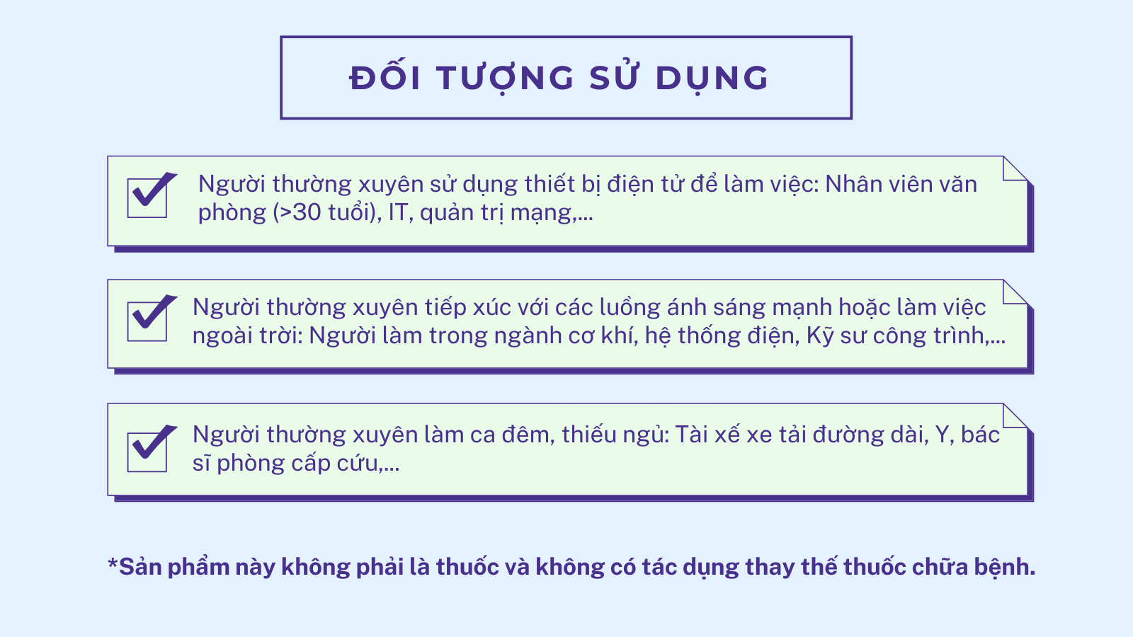 • Người thường xuyên sử dụng thiết bị điện tử để làm việc: Nhân viên văn phòng (>30 tuổi), IT, quản trị mạng,