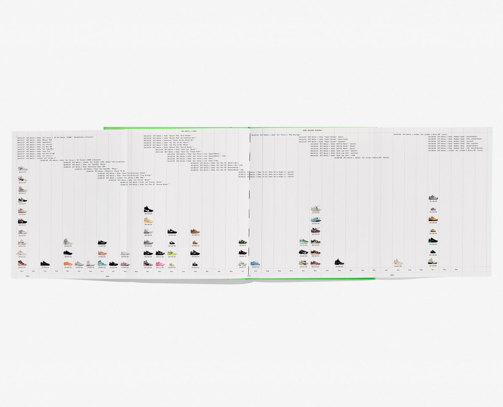 The book documents Abloh’s cooperative way of working and reaffirms the power of print. For its design Nike and Abloh partnered with the acclaimed London-based design studio Zak Group. Together they conceived a two-part compendium, equal parts catalog and conceptual toolbox. The first part of the book presents a visual culture of sneakers while a lexicon in the second part defines the key people, places, objects, ideas, materials, and scenes from which the project grew. Texts by Nike’s Nicholas Schonberger, writer Troy Patterson, curator and historian Glenn Adamson, and Virgil Abloh himself frame the collaborative work within fashion and design history. A foreword by Hiroshi Fujiwara places the project within the historical continuum of Nike collaborators.