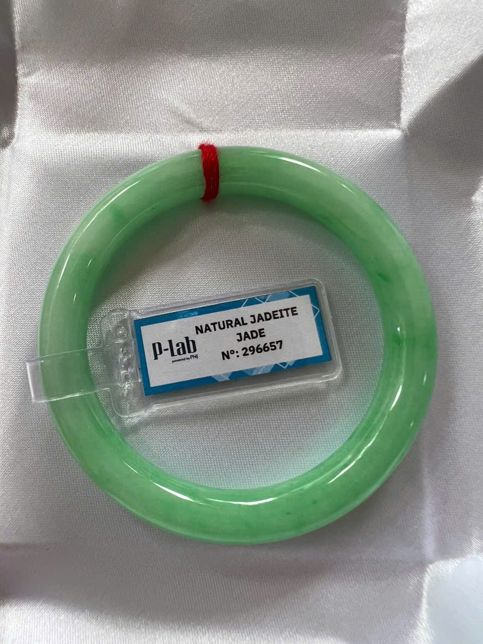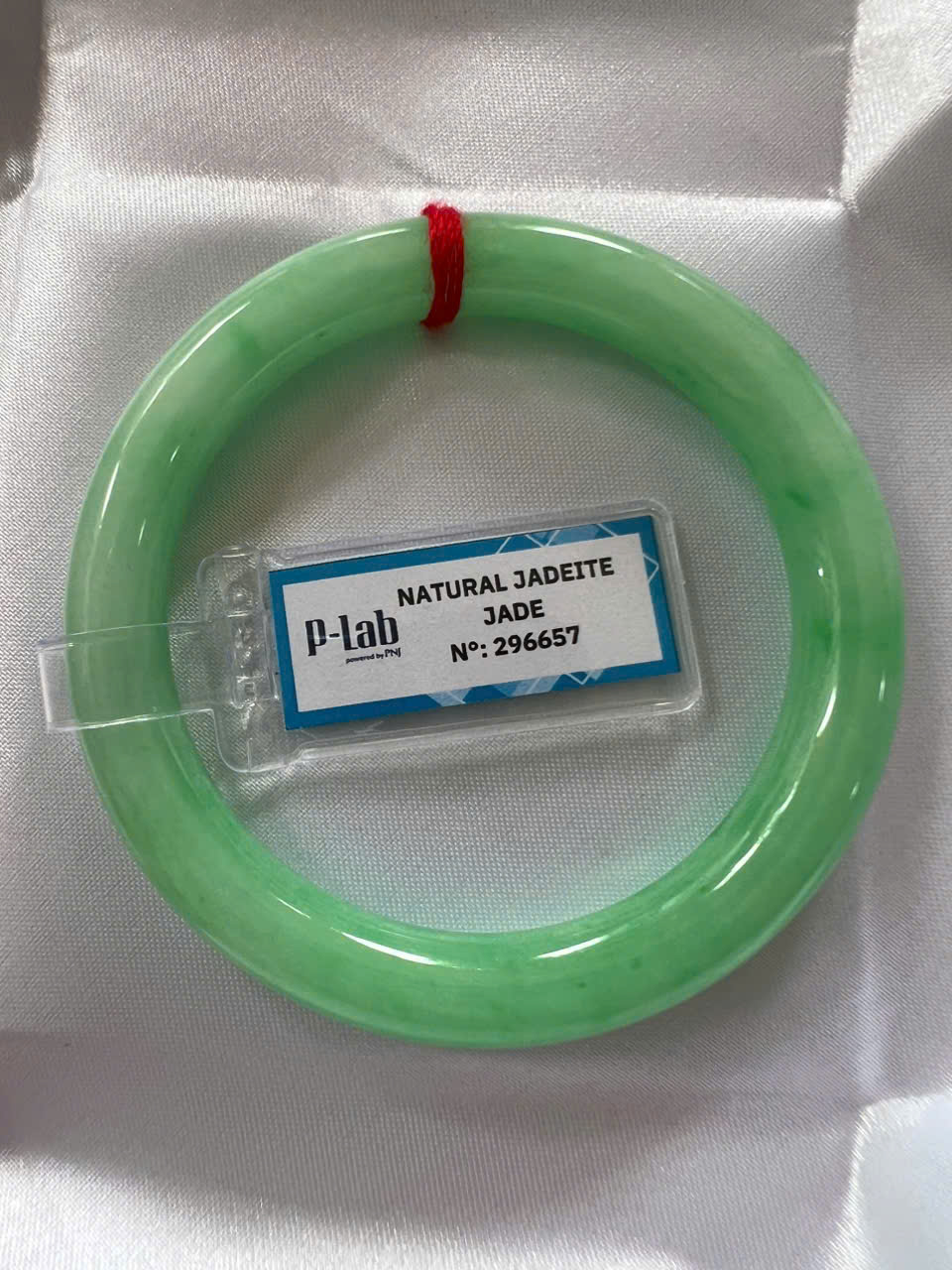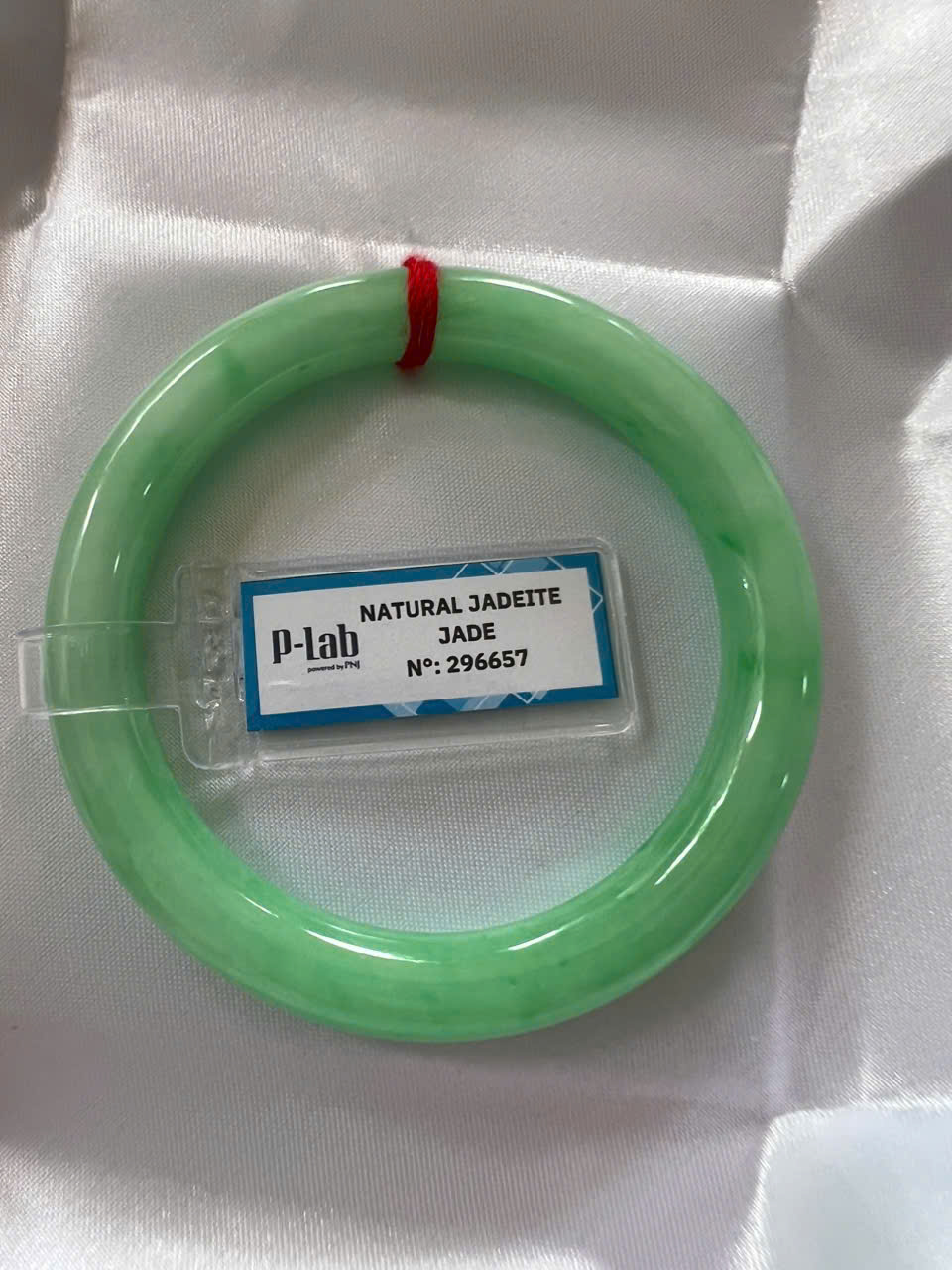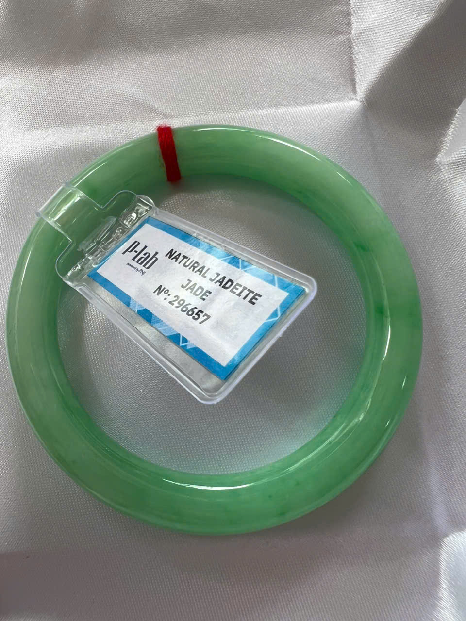 Vòng Cẩm Thạch Tự Nhiên Kiểm Định P Lab No 296657 Vip Sịn Ni 52mm x Chột 8mm Màu Xanh Lý Trắng nhẹ đều bóng mượt các Chị tay lên tay đẹp xuất sắc sịn sang xinh lắm nữ 50kg - 56kg đeo ạ