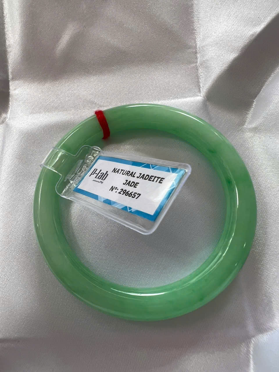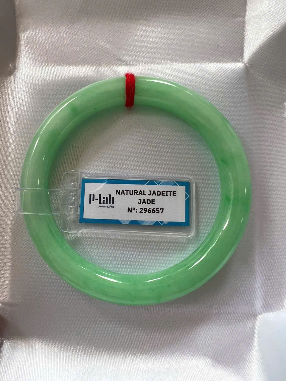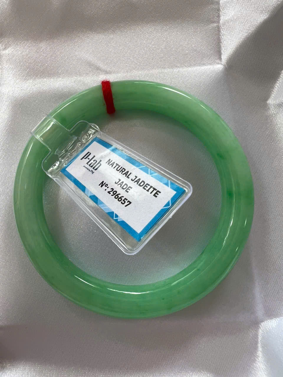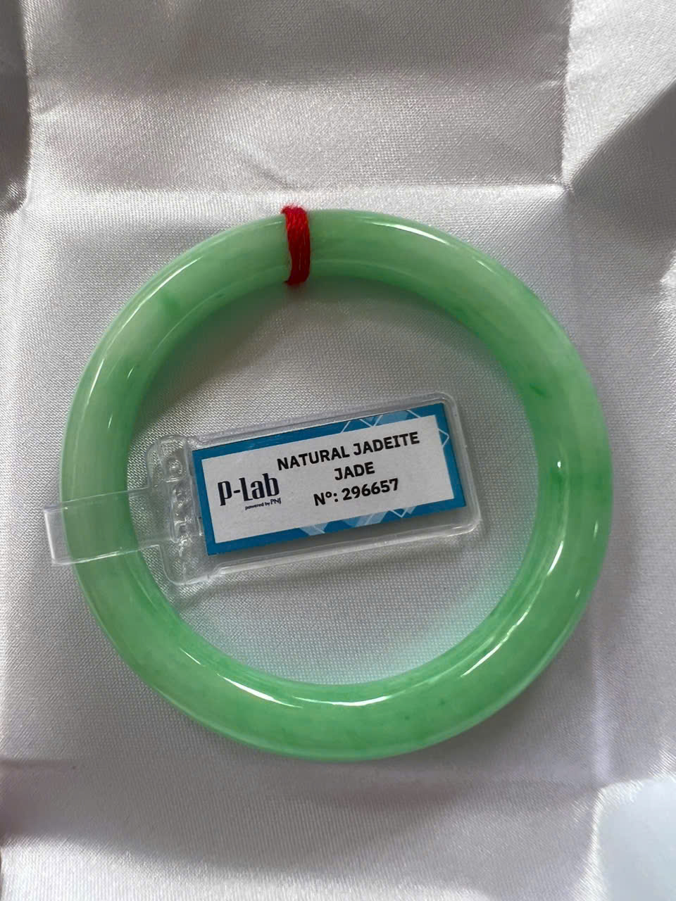 Vòng Cẩm Thạch Tự Nhiên Kiểm Định P Lab No 296657 Vip Sịn Ni 52mm x Chột 8mm Màu Xanh Lý Trắng nhẹ đều bóng mượt các Chị tay lên tay đẹp xuất sắc sịn sang xinh lắm nữ 50kg - 56kg đeo ạ