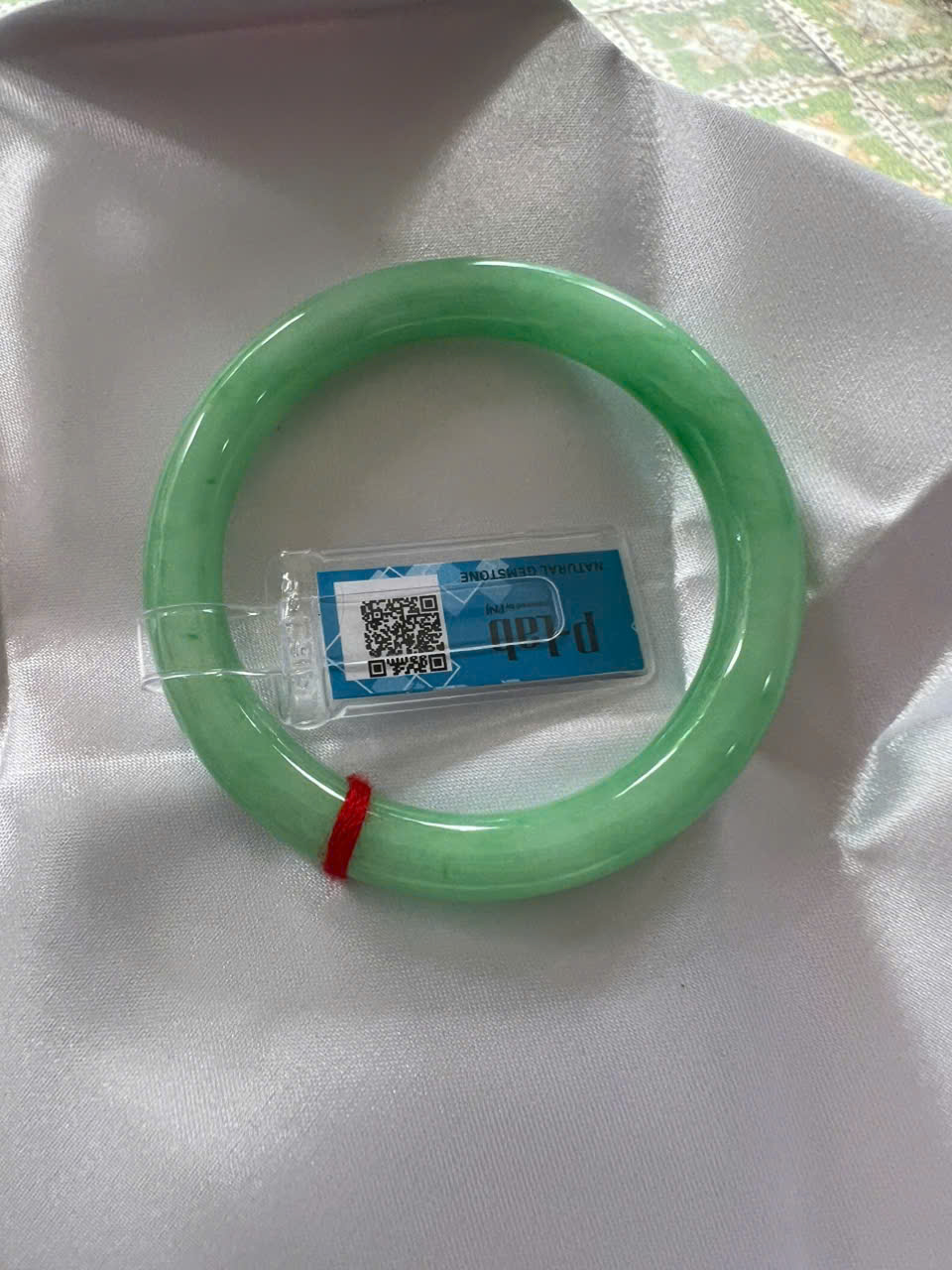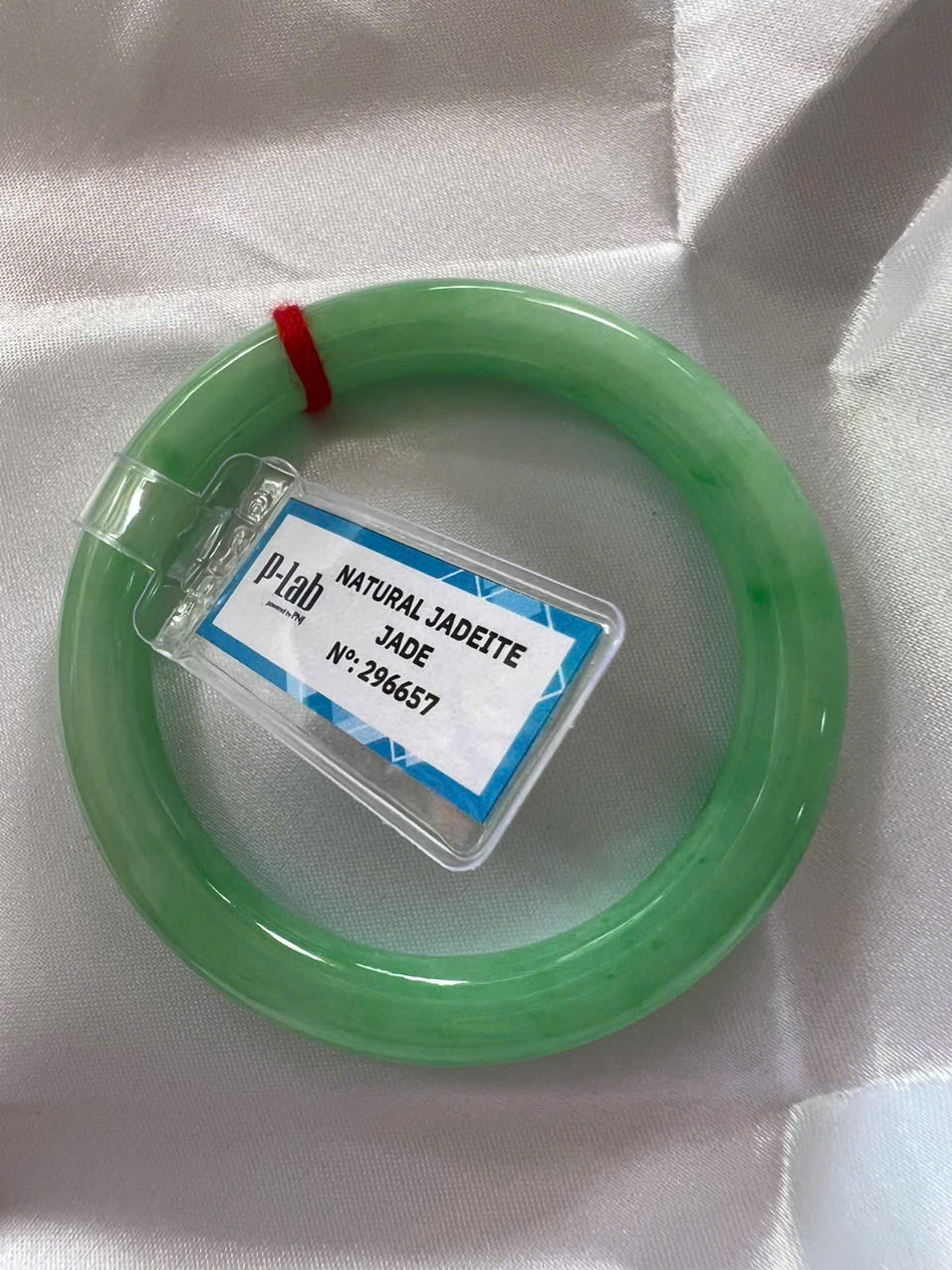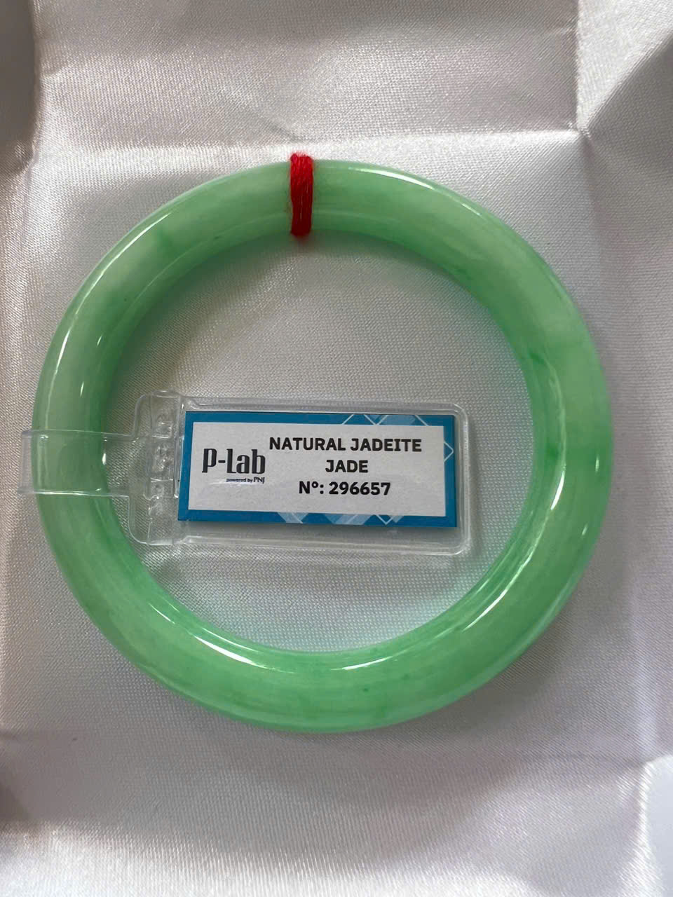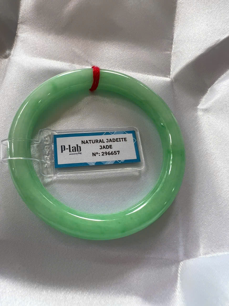 Vòng Cẩm Thạch Tự Nhiên Kiểm Định P Lab No 296657 Vip Sịn Ni 52mm x Chột 8mm Màu Xanh Lý Trắng nhẹ đều bóng mượt các Chị tay lên tay đẹp xuất sắc sịn sang xinh lắm nữ 50kg - 56kg đeo ạ