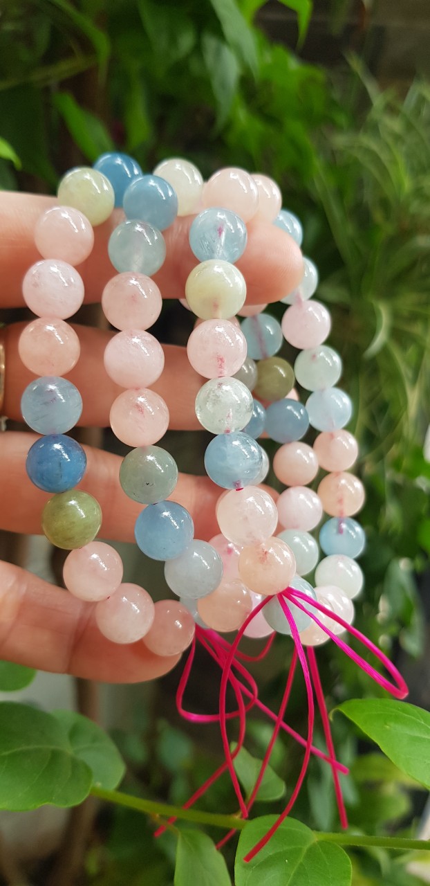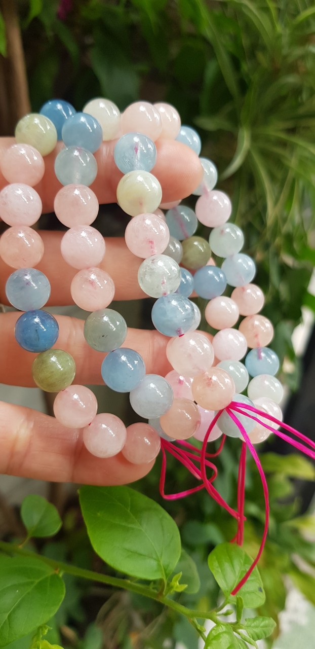 Vòng tay chuỗi đá Beryl tự nhiên đa sắc màu tươi sáng bóng mượt đẹp size hạt 9mm là sự phối hợp tông màu hồng ngọt ngào với xanh dương xanh nước biển đậm nữ đeo tay đẹp xinh tay may mắn tốt cho sức khỏe công việc tài lộc