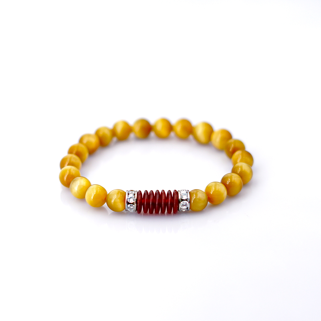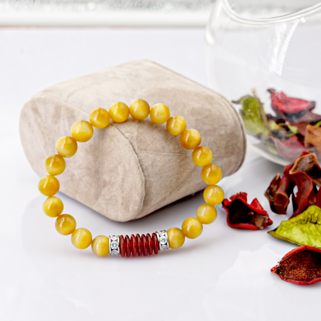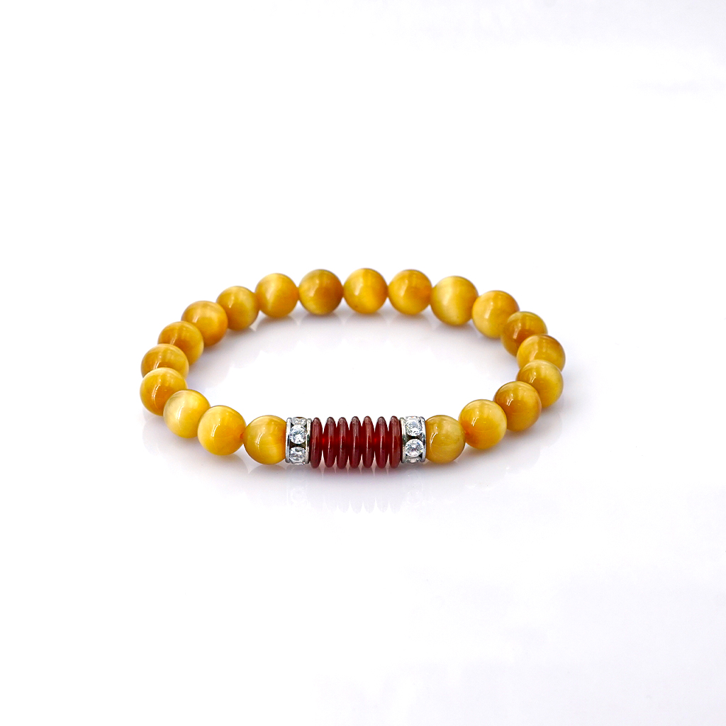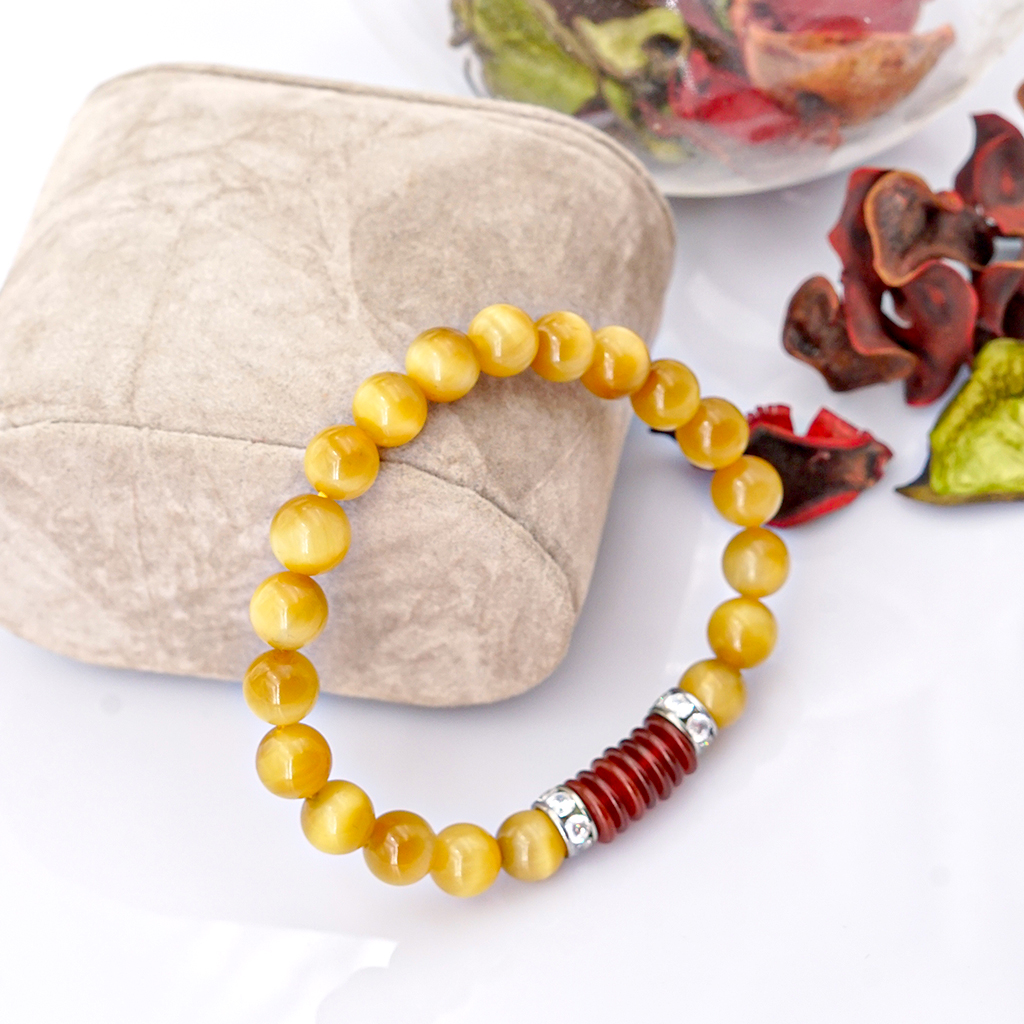Vòng tay phong thủy Mắt hổ vàng tâm 8mm + Khoen mã não by Anqlo là sản phẩm được chế tác tinh xảo, có độ hoàn thiện cao bởi các nghệ nhân lâu năm trong
