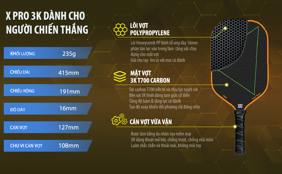 Đây, em chứng nhận vợt pickleball X PRO 3K, vào internet tra cứu cũng có. Vợt này đánh đâu thắng đó, cứ để trong túi, khi nào đấu mang ra. Có tý tăng lực phản và xoáy do mặt làm từ sợi 3K nên dẻo và sần. Phải biết chơi rồi thì cầm vợt này mới thấy đã.