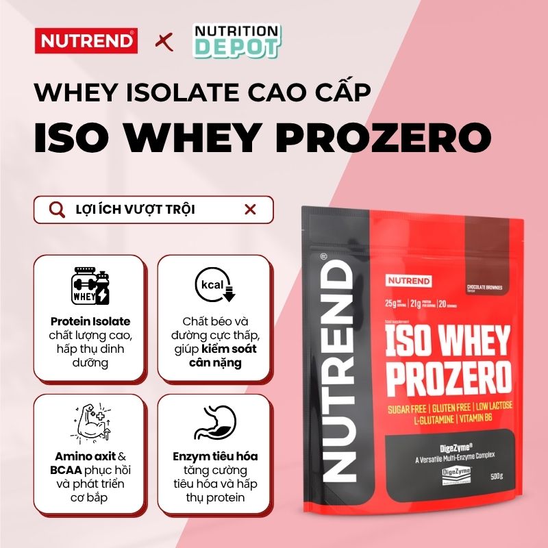 - Nutrend ISO WHEY Prozero là một sự hỗ trợ tuyệt vời cho mọi mục tiêu luyện tập, bất kể mục tiêu cá nhân của bạn là phát triển thật nhiều cơ bắp hay đơn giản là để có cơ thể săn chắc hơn hoặc cần nạp thêm protein vào chế độ ăn uống hàng ngày. LỢI ÍCH CHÍNH VÌ SAO BẠN NÊN CHỌN NUTREND ISO WHEY PROZERO -100% Whey Isolate tinh khiết, chất lượng cao: Whey Isolate là một trong những nguồn protein tốt nhất và chứa tự nhiên các axit amin BCAA. Loại bỏ hầu như lactose có trong sữa, không chứa chất béo và đường. Đây là lựa chọn tuyệt vời cho chế độ ăn ít calo. -Protein là chất dinh dưỡng cần thiết và quan trọng cho cơ thể. Nutrend ISO WHEY Prozero cung cấp hàm lượng 21g protein/ serving giúp cho cơ bắp được phục hồi, duy trì và phát triển, cơ được săn chắc hơn. -Enzym tiêu hóa DigeZyme: Nutrend ISO WHEY Prozero có tốc độ hấp thụ nhanh hơn nhờ hỗn hợp được cấp bằng sáng chế gồm 5 loại enzym tiêu hóa giúp phân giải và tiêu hóa protein tối ưu. Từ đó cơ thể bạn sẽ đạt hiệu quả hơn trong quá trình xây dựng khối cơ bắp. -BCAA theo tỷ lệ phổ biến 2:1:1 là thành phần quan trọng của protein đóng vai trò quan trọng trong việc kích thích tổng hợp protein và hỗ trợ phát triển cơ bắp.