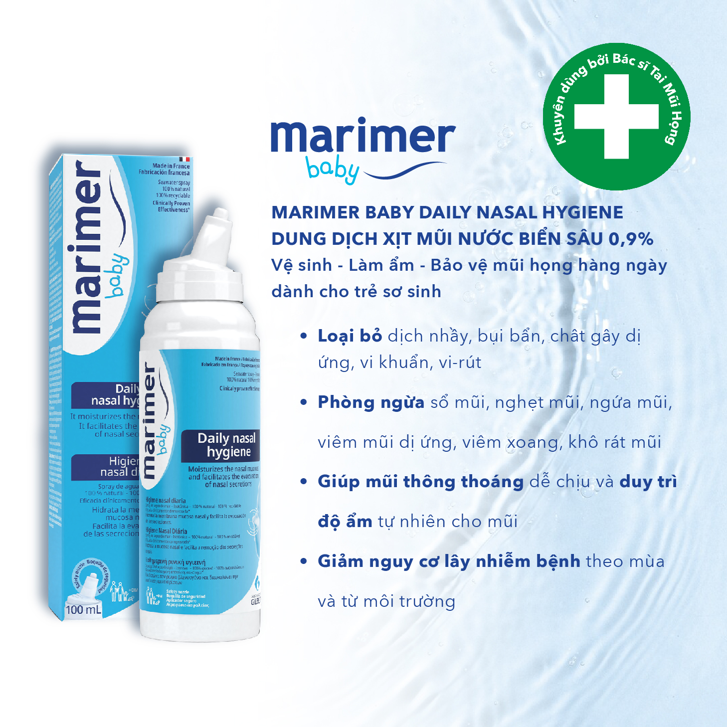 Dung dịch xịt mũi Marimer là dung dịch nước biển tự nhiên 100%, giàu muối khoáng và các nguyên tố vi lượng. Có thể sử dụng hàng ngày nhờ nồng độ sinh lý (đẳng