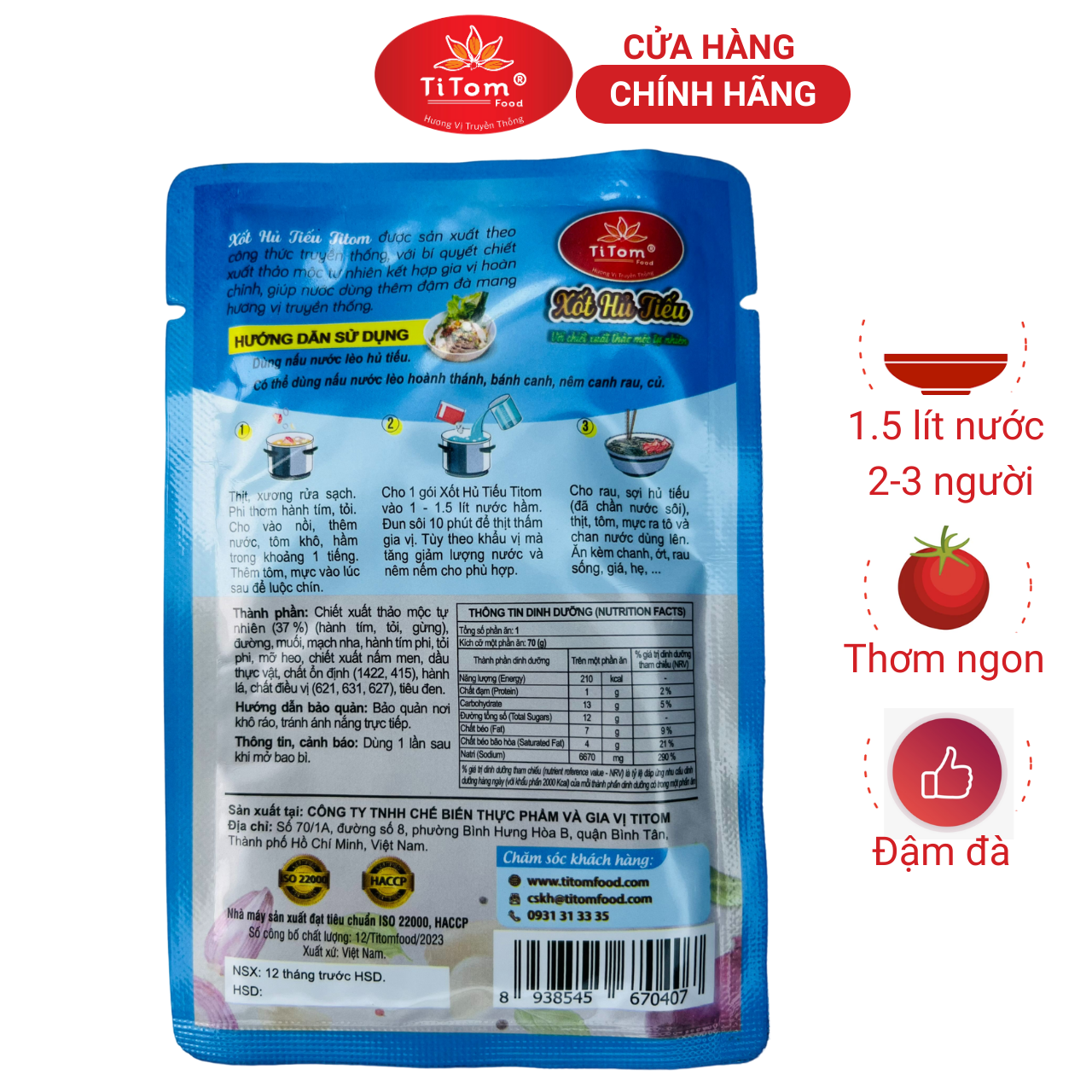 -Xốt hủ tiếu Titom là gia vị nấu hủ tiếu nêm sẵn hoàn chỉnh dùng nấu nước lèo hủ tiếu, cho bạn một nồi nước dùng hủ tiếu thơm ngon chuẩn vị, không cần nêm nếm.