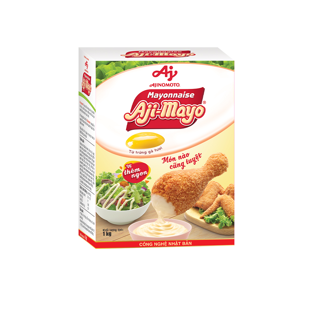 Xốt mayonnaise Aji-mayo 1kg hộp     Aji-mayo là loại xốt đa năng với vị chua béo hài hòa, thích hợp với nhiều món ăn của gia đình Việt như chấm, phủ, trộn. Với công thức cải tiến, Aji-mayo mang đến vị ngon bất ngờ cho bữa cơm gia đình, giúp bé ăn nhiều rau hơn. Thành phần: Dầu thực vật (dầu đậu nành, dầu hạt cải), nước, đường, trứng gà tươi 4 %, bột trứng, muối, chất ổn định (hydroxypropyl distarch phosphat, gôm xanthan), giấm, chất điều chỉnh độ acid (acid acetic băng, acid citric), chất điều vị (mononatri L-glutamat), chất bảo quản (kali sorbat, dinatri ethylendiamintetraacetat (EDTA)), chất chống oxy hóa (butyl hydroxytoluen (BHT)), chất tạo ngọt tổng hợp (sucralose (triclorogalacto sucrose)), phẩm màu tổng hợp (beta-caroten tổng hợp). Hướng dẫn sử dụng: Dùng cho các món chấm, phủ, trộn. Hướng dẫn bảo quản: