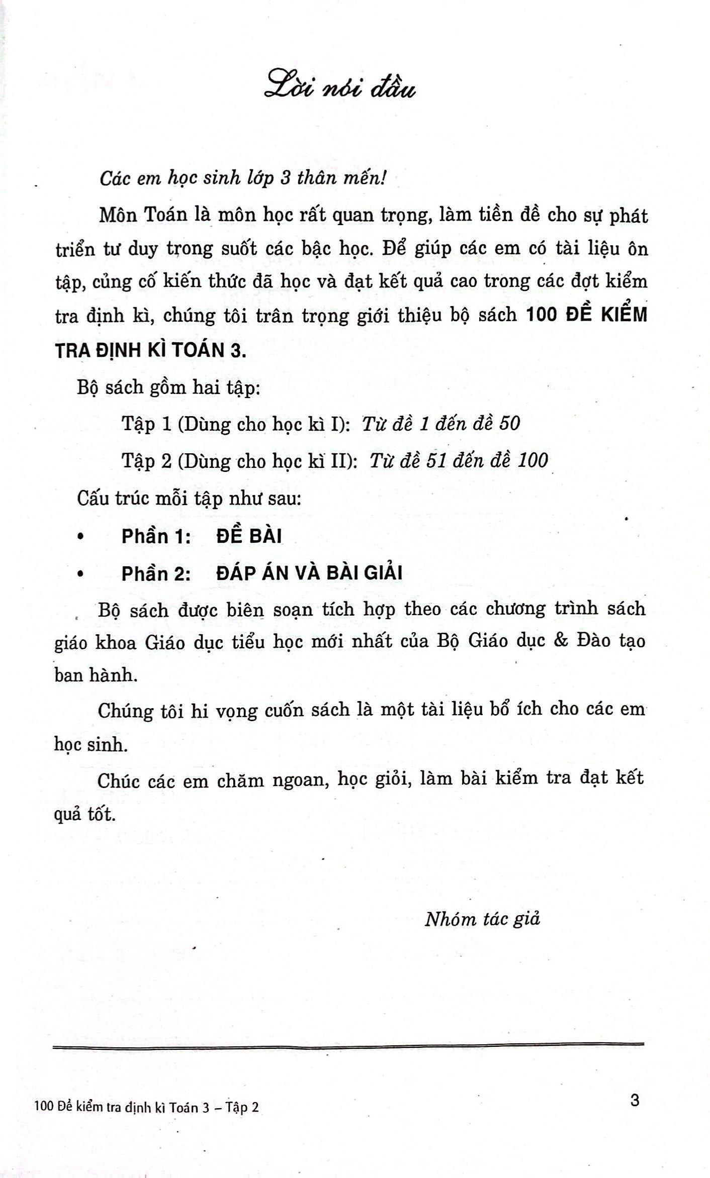 Môn Toán là môn học rất quan trọng, làm tiền đề cho sự phát triển tư duy trong suốt các bậc học. Để giúp các em có tài liệu ôn tập, củng cố kiến thức đã học và đạt kết quả cao trong các đợt kiểm tra định kì, chúng tôi trân trọng giới thiệu bộ sách 100 ĐỀ KIỂM TRA ĐỊNH KÌ TOÁN 3. Bộ sách gồm hai tập: