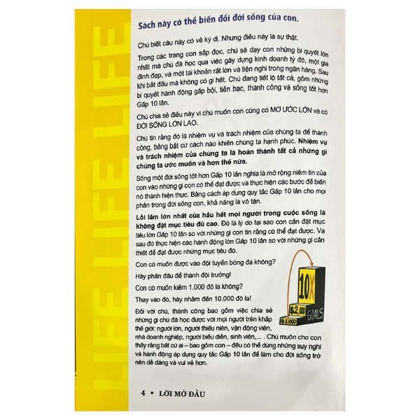 Chú biết câu này có vẻ kỳ dị. Nhưng điều này là sự thật. Trong các trang con sắp đọc, chú sẽ dạy con những bí quyết lớn nhất mà chủ đa học qua viêc gây dựng kinh doanh tỷ độ, một gia đinh đẹp, và một tài khoản rất lớn và tiện nghi trong ngân hàng. Sau khi bắt đầu mà không có gì hết. Chú đang tiết lộ tất cả, gồm những bí quyết hành động gấp bội, tiền bạc, thành công và sống tốt hơn Gấp 10 lần. Chú chia sẻ điều này vì chú muốn con cũng có MƠ ƯỚC LỚN và có ĐỜI SỐNG LỚN LAO. Chú tin rằng đó là nhiệm vụ và trách nhiệm của chúng ta để thành công, bằng bất cứ cách nào khiến chúng ta hạnh phúc. Nhiệm vụ và trách nhiệm của chúng ta là hoàn thành tất cả những gì chúng ta ước muốn và hơn thế nữa. Sống một đời sống tốt hơn Gấp 10 lần nghĩa là mở rộng niềm tin của con vào những gì con có thể đạt được và thực hiện các bước để biến nó thành hiện thực. Bằng cách áp dụng quy tắc Gấp 10 lần cho mọi phần trong đời sống con, khả năng là vô tận. Lồi lầm lớn nhất của hu hết mọi người trong cuộc sống là không đặt mục tiêu đủ cao. Đó là lý do tại sao con cần đặt mục tiêu lớn Gấp 10 lần so với những gì con tin rằng có thể đạt được. Và sau đó thực hiện các hành động lớn Gấp 10 lần so với những gì cân thiết để đạt được những mục tiêu đó. Con có muốn được vào đội tuyển bóng đá không? Hãy phấn đấu để thành đội trưởng! Con có muốn kiếm 1.000 đô la không? Thay vào đó, hãy nhắm đến 10.000 đô la! Đối với chú, thành công bao gồm việc chia sẻ ($2,00| những gì chú đá học được với mọi người trên khắp GOALS S1,000 thế giới: người lớn, người thiếu niên, vận động viên, nhà doanh nghiệp, người biểu diễn, sinh viên, Chú muốn cho con thấy ràng bắt cứ ai - bao gồm con - đều có thể dùng những suy nghĩ và hành động áp dụng quy tắc Gấp 10 lần để làm cho đời sống trở nên dễ dàng và vui vẻ hơn.