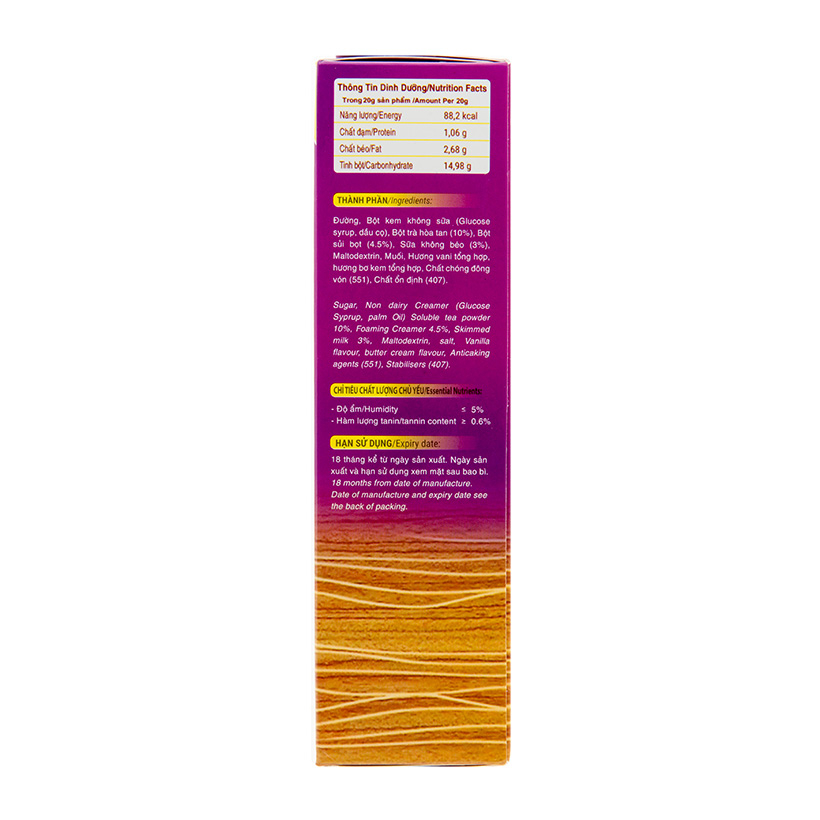 Thành phần: Sữa bò, đường, hồng trà, sữa bột nguyên kem, sữa bột tách béo, dextrin, muối, chất nhũ hóa, hương hồng trà tự nhiên, chất chống oxi hóa: Ascorbic Acid (L-) (E300) HDSD: Lắc