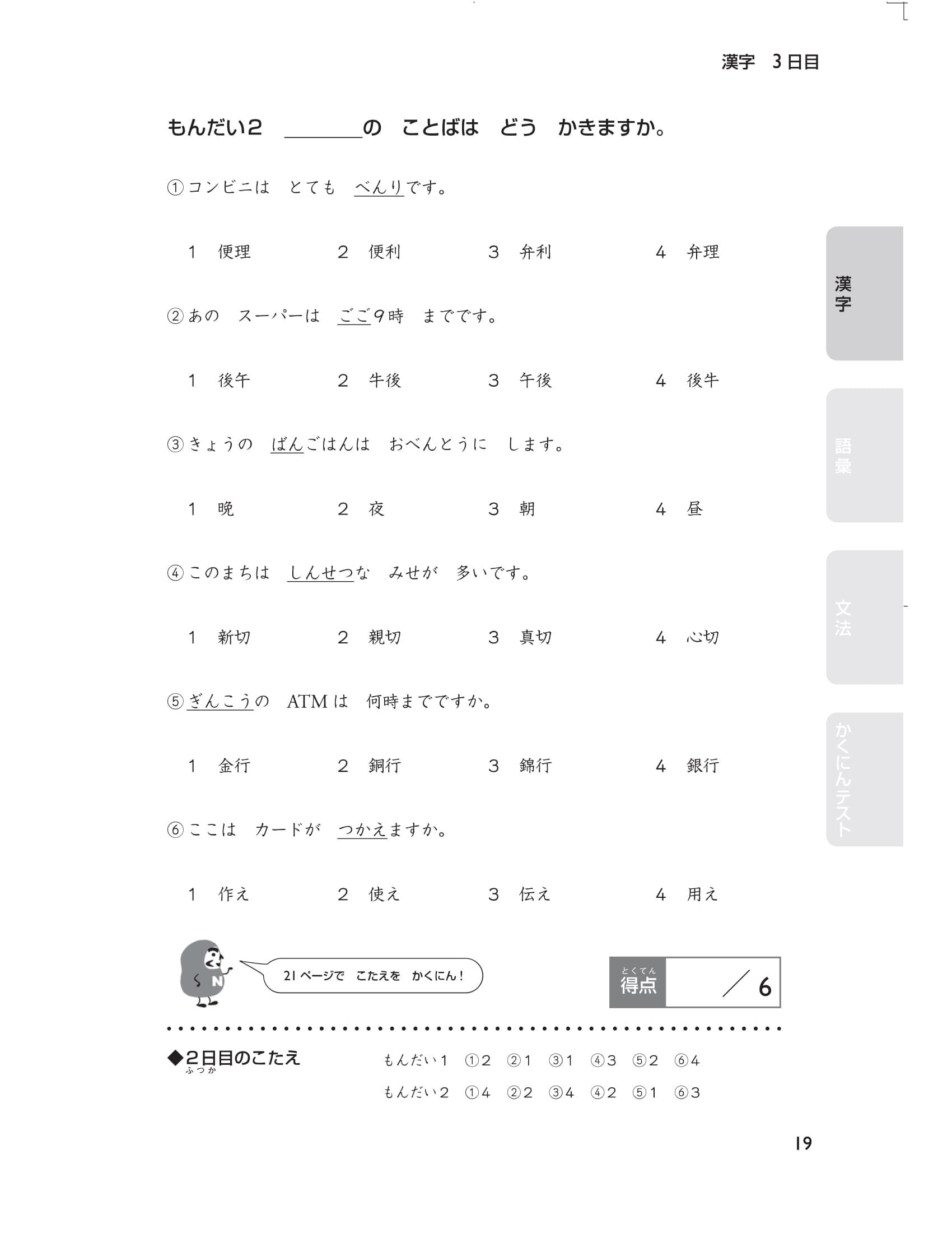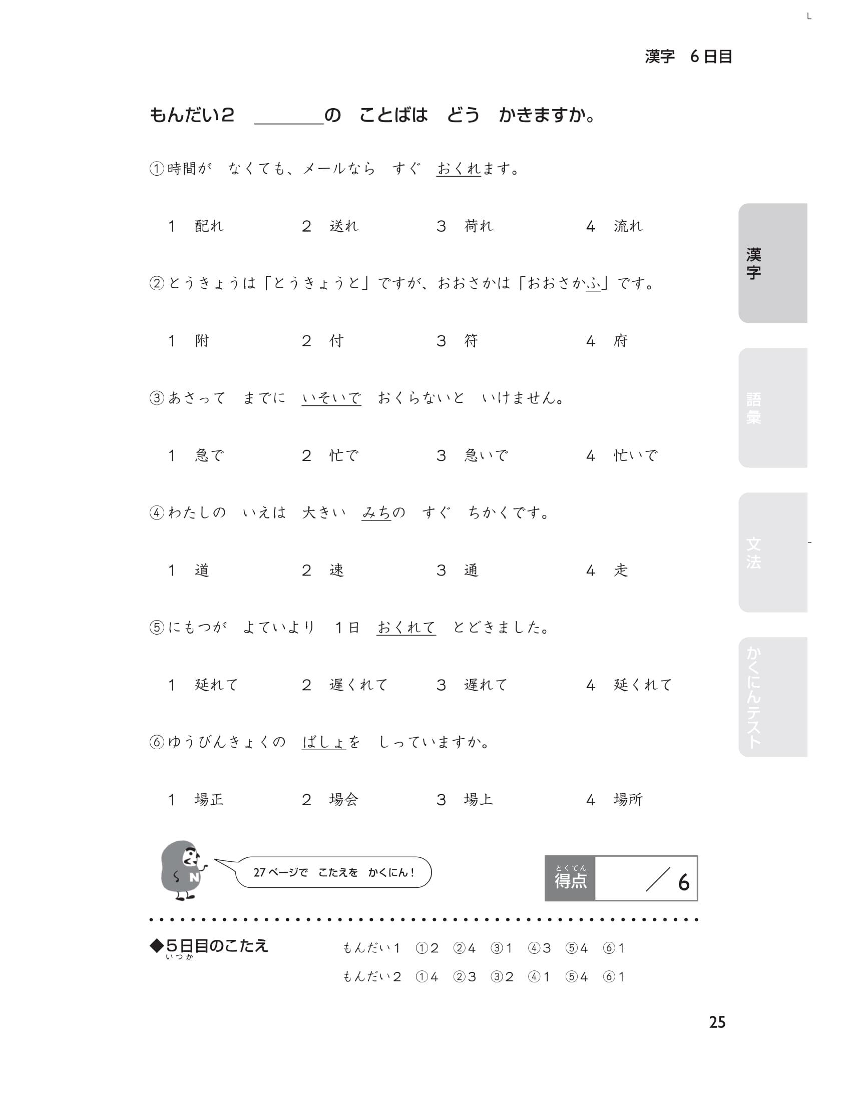 Cuối cùng, có 5 bài thi thử (tổng cộng 40 câu hỏi) mô phỏng đề thi năng lực tiếng Nhật. Thử thách bản thân ngay trước kỳ thi bằng cách xem lại nhiều lần những chỗ mình đã sai ( thứ tự các phần trong đề thi chính thức là chữ Hán, từ vựng và cuối cùng là ngữ pháp) bạn nhé. Hãy sử dụng cuốn sách này một cách hiệu quả Chúng tôi đã chuẩn bị rất nhiều câu hỏi để các bạn có thể luyện tập trong 15 ngày theo thứ tự các phần: chữ Hán, từ vựng, ngữ pháp. Hơn nữa, thông qua bảng checklist bạn có thể dễ dàng phân bổ số lượng câu hỏi nên làm trong một ngày và sắp xếp kế hoạch học tập cho đến thời điểm thi sao cho phù hợp.