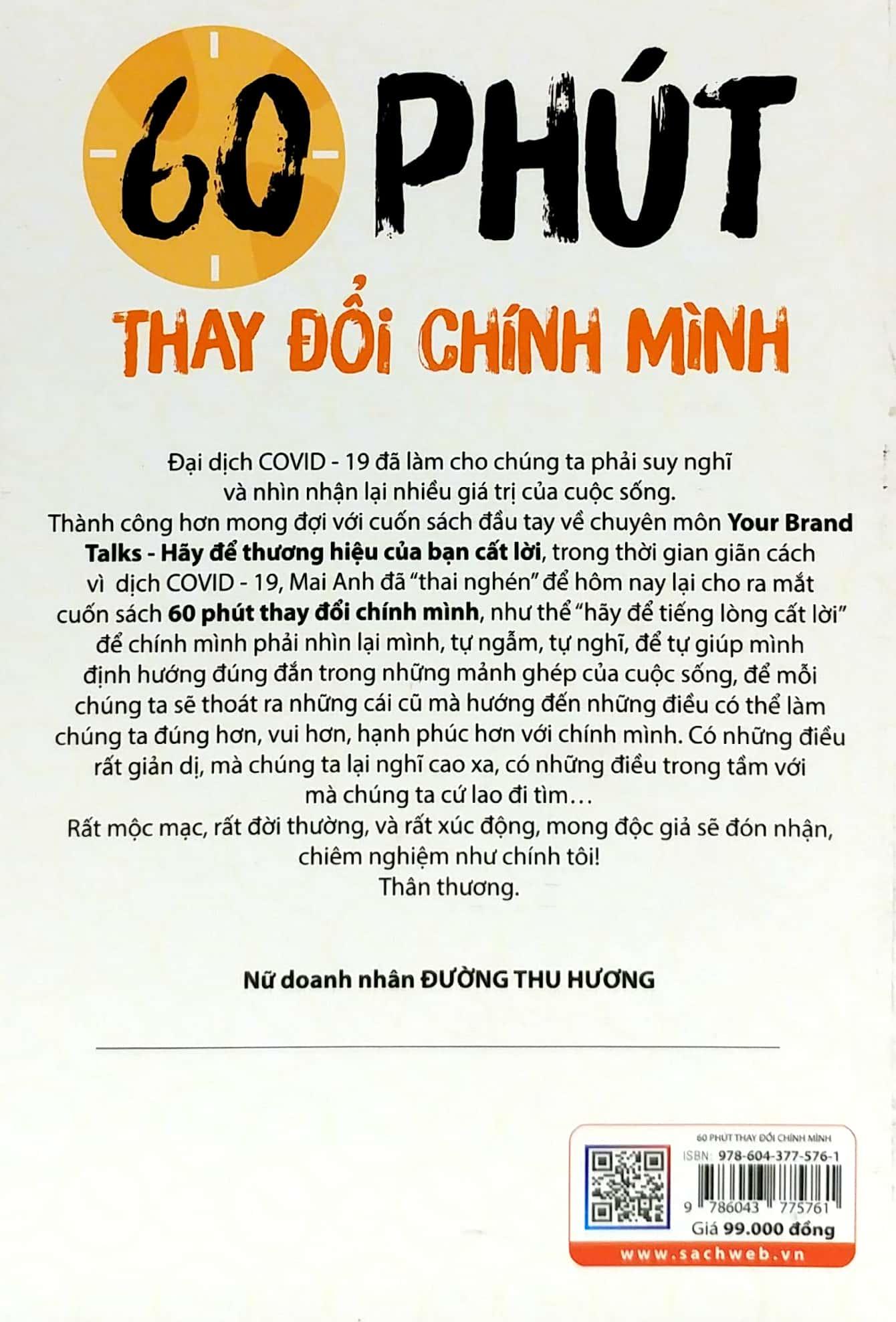 60 Phút Thay Đổi Chính Mình "Hành trình nào rồi cũng sẽ có đích đến, dù viên mãn hay không nhưng ít nhất, chúng ta đã luôn cố gắng từng phút giây, vì thời gian không bao giờ có thể quay trở lại. Thế nên chọn mà đi, là hành trình chọn cho mình mà không phải chọn vì người khá". - Lê Mai Anh 60 phút thay đổi chính mình - Những chia sẻ truyền cảm hứng giúp bạn trẻ tốt hơn mỗi ngày - Tác giả: Lê Mai Anh