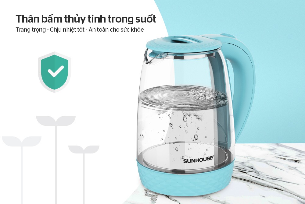 - Thân ấm làm bằng thủy tinh cao cấp trong suốt Ấm siêu tốc 1.8 L SUNHOUSE SHD1215 có kiểu dáng đẹp, sang trọng. Thân ấm bằng thủy tinh chịu nhiệt trong suốt, hoa văn bắt mắt, tính thẩm mỹ cao, không bị oxi hóa nên rất an toàn cho sức khỏe và tiện lợi khi vệ sinh. Đế, nắp và tay cầm làm bằng nhựa cao cấp màu xanh ngọc, chống nóng tốt. Ấm mang diện mạo trẻ trung, hiện đại, trang nhã.