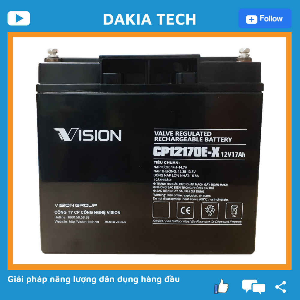Ắc quy Vision 12V 17Ah cho độ bền bỉ và hiệu năng sử dụng cao nhất Thương hiệu: Vision Mã sản phẩm: CP12170E-X (12V – 17Ah) Xuất xứ: Việt Nam Đặc tính: Ắc quy khô,