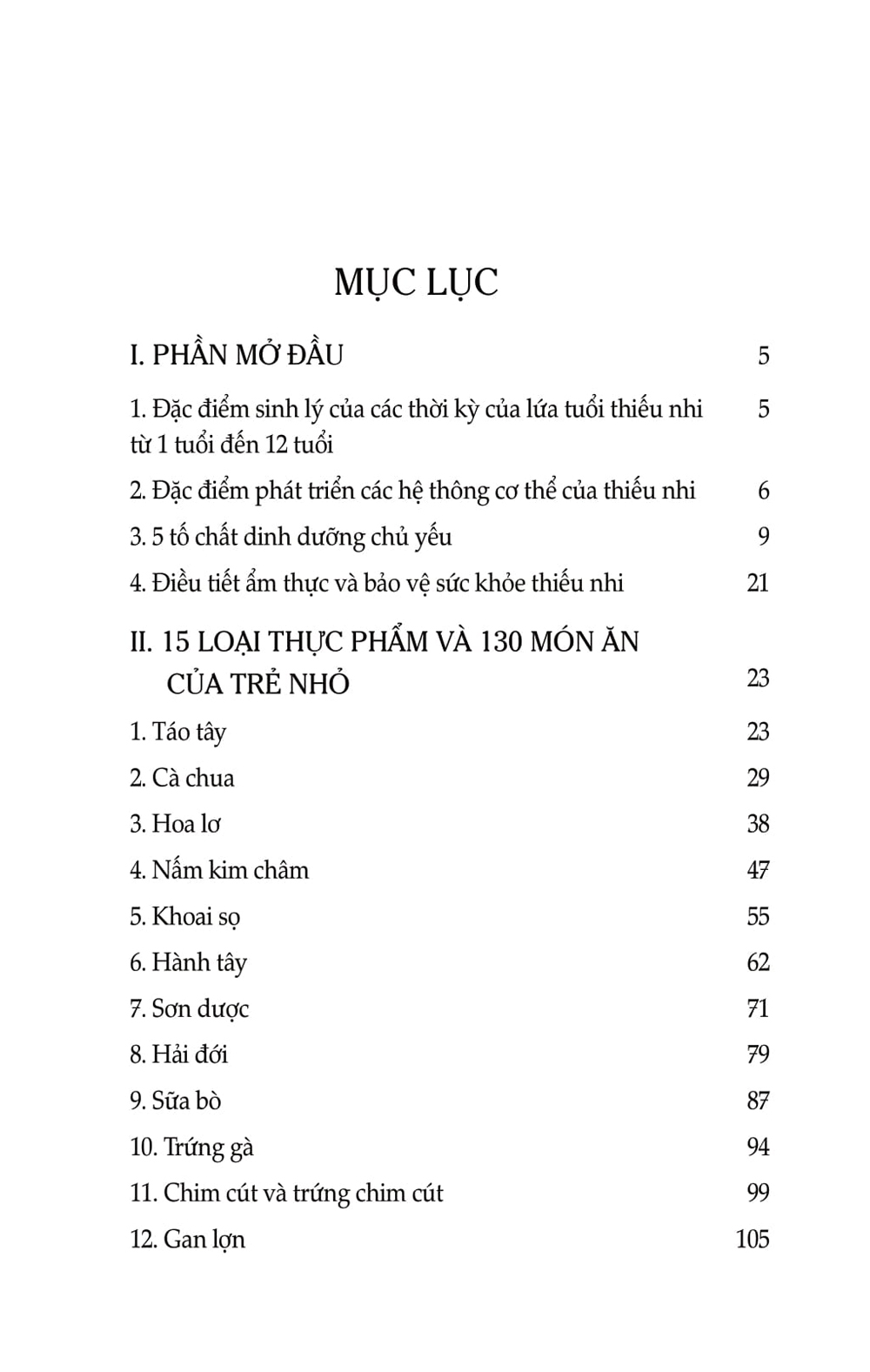 Mua tại TiktokSách trình bày đặc điểm sinh lý của các thời kỳ của lứa tuổi thiếu nhi từ 1 tuổi đến 12 tuổi, đặc điểm phát triển các hệ thống của thiếu nhi, 5 tố chất dinh dưỡng chủ yếu, điều tiết ẩm thực và bảo vệ sức khỏe thiếu nhi; giới thiệu 15 loại thực phẩm và 130 món ăn dành cho trẻ nhỏ; các phương thức chăm sóc sức khỏe thiếu nhi,…