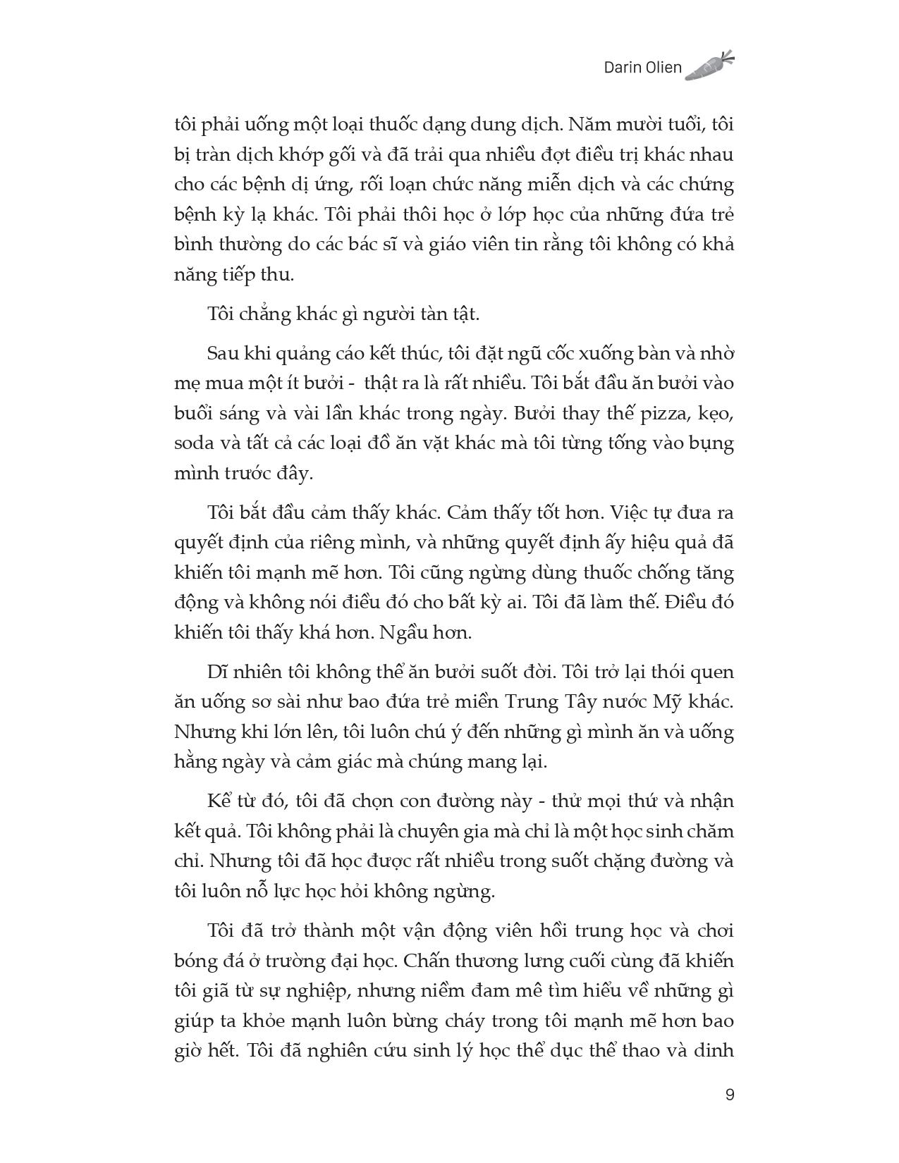 Trong Ăn sạch sống xanh, tâm lành trí khỏe, Darin Olien cung cấp cho chúng ta một cách suy nghĩ hoàn toàn mới về sức khỏe và hạnh phúc bằng cách xác định các động lực sống: Dinh dưỡng chất lượng, Hydrat hóa, Giải độc, Oxy hóa và Kiềm hóa, cho chúng ta biết cách duy trì cân nặng hợp lý, ngăn ngừa ngay cả những căn bệnh nghiêm trọng nhất. Chúng ta luôn được dạy phải xem máu, xương, da, các cơ quan, các nơ-ron thần kinh và tất cả mọi thứ khác một cách riêng rẽ và mỗi bộ phận lại mang đến những vấn đề hay mối lo ngại không giống nhau. Nhưng sự thật là, mỗi một bộ phận nhỏ nhất bên trong cơ thể người, mọi phân tử và tế bào đều phản ứng với năm sinh lực của cuộc sống kể trên. Việc ta cần làm chỉ là làm sao nắm bắt những yêu cầu đó - năm sinh lực của cuộc sống. Và sau đó, ta phải cố gắng hết sức để hoàn thành.