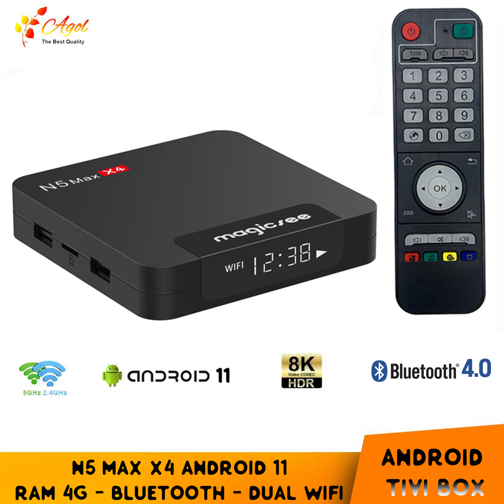 AGOL SHOP XIN GIỚI THIỆU SẢN PHẨM Android tivi box magicsee N5 max x4 Rom 64G Ram 4G bluetooth, Android 11, S905X4, wifi 2 băng tần, cài sẵn phim HD, truyền hình cáp miễn phí vĩnh