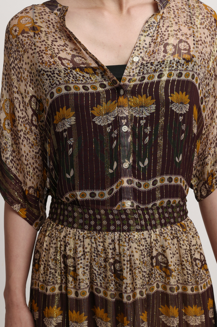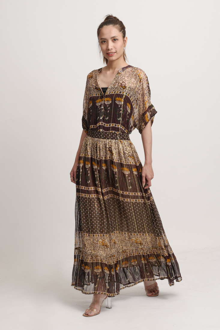 Áo cotton cao cấp, nền vải ánh kim nhẹ, màu ombre độc đáo. Phom suông, có thể mặc thành đầm dấu quần phối với quần short, hoặc mặc với quần jeans, quần legging. Dài 78cm.