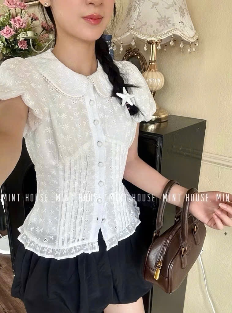 CHI TIẾT SẢN PHẨM ✿ Sản phẩm : Áo sơ mi tay ngắn viền ren dễ thương nữ tính cột nơ sau dễ phối đồ Jenni Miều Est.2013 ✿ Chất liệu : Xô Ren ✿