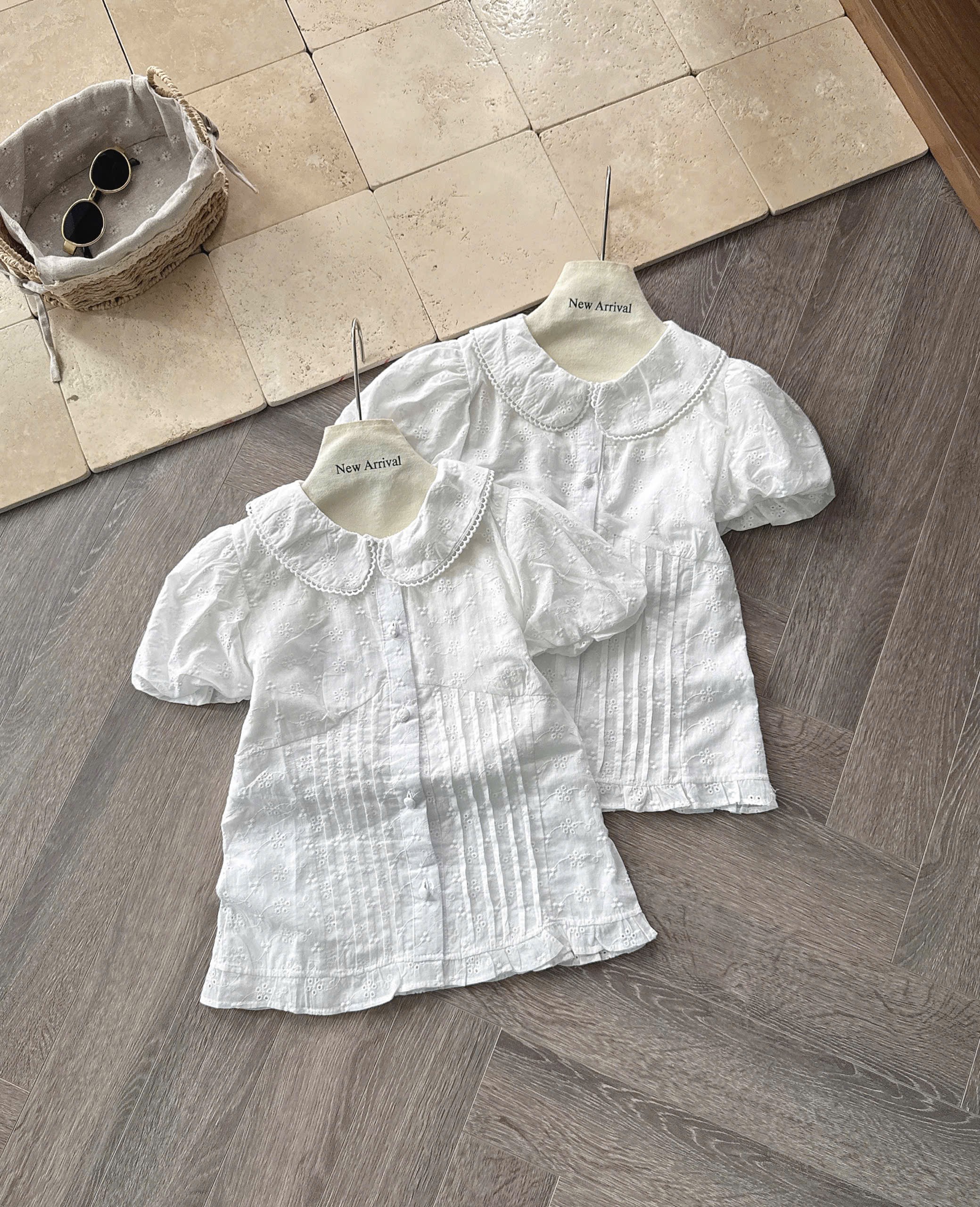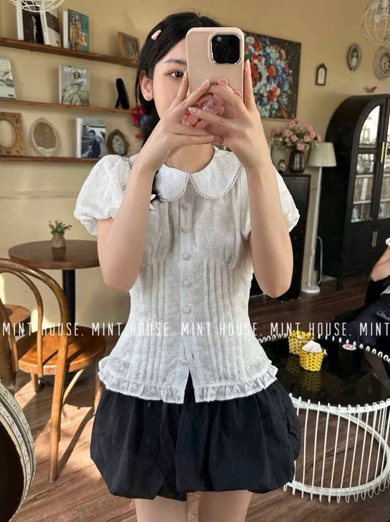 CHI TIẾT SẢN PHẨM - Sản phẩm : Áo sơ mi kiểu tay phồng dễ thương nữ tính dành cho nữ Ainee Miều Est.2013 - Chất liệu : Xô Ren - Màu sắc : TRẮNG