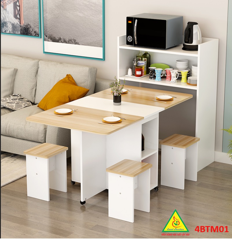 Bàn ăn gấp gọn thông minh Với các gia đình có diện tích phòng ăn không lớn lắm thì Bàn ăn gấp gọn này chính là sự lựa chọn lý tưởng nhất. Bàn ăn có kích thước nhỏ gọn, kết cấu thông minh có thể gấp gọn lại khi không sử dụng tiết kiệm diện tích. Bàn được làm bằng gỗ công nghiệp MDF cao cấp phủ melamine láng mịn, tính thẩm mỹ cao thu hút được sự chú ý của khách hàng. Tích hợp 3 in 1: Bàn, Tủ và Kệ thật Sang - Chảnh - Đẳng Cấp Dù nhà lớn hay nhỏ thì chiếc Bàn Ăn Thông Minh sẽ làm không gian gọn gàng hơn, thoáng hơn và đẹp hơn.