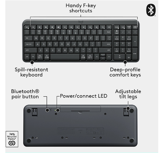Gõ phím dễ dàng với bàn phím logitech không dây Bluetooth K251, một bàn phím đơn giản, đầy đủ tính năng, không dây và bền bỉ với các bộ phận bằng nhựa sử dụng tối thiểu 64% vật liệu tái chế....