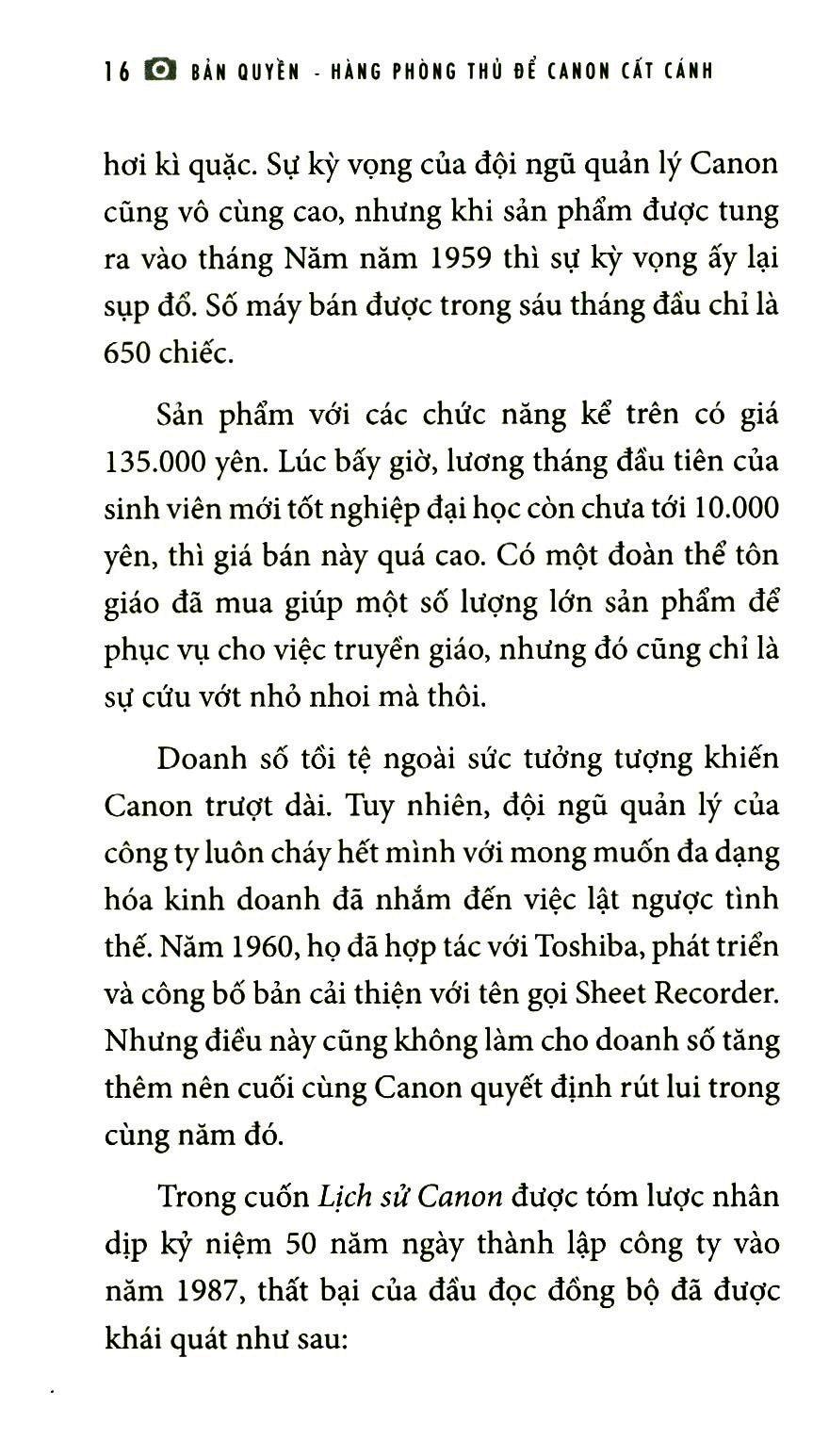 Trong Bản quyền – Hàng phòng thủ để Canon cất cánh, Giichi Marushima sẽ kể lại những kinh nghiệm của bản thân trong suốt 40 năm hoạt động trong lĩnh vực bằng sáng chế, đồng thời chia sẻ những suy nghĩ và ý kiến cá nhân về chiến lược sở hữu trí tuệ – chiến lược sẽ thu hút được các doanh nghiệp Nhật Bản. Từ đó chúng ta sẽ hiểu được sở hữu trí tuệ đã giúp Canon trở thành một tập đoàn đa quốc gia hùng mạnh như thế nào? Và chúng ta có thể học được gì từ đó.