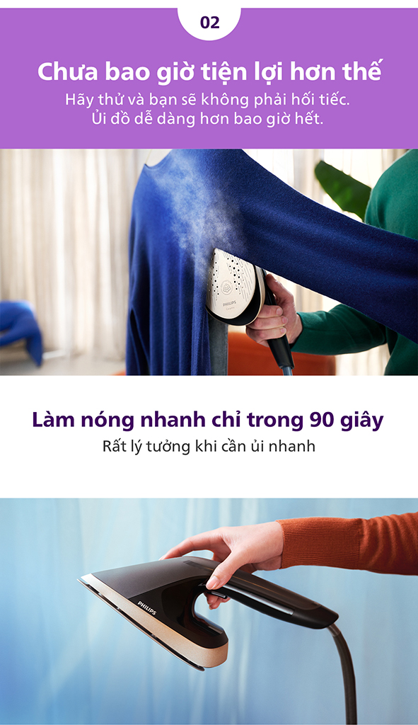 Đặc điểm nổi bật Bàn ủi hơi nước đứng Philips với công nghệ làm nóng kép cho hơi phun mạnh, thấm sâu Công nghệ OptimalTEMP giúp không gây ra vết cháy trên mọi loại vải