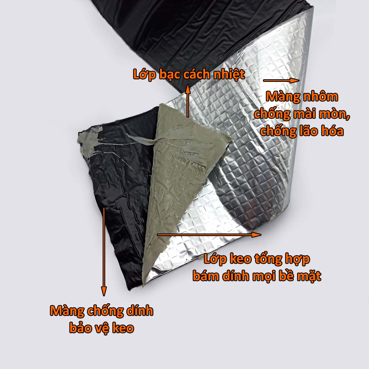 Cuộn băng keo khổ 50mm, dài 5 mé Cấu tạo 4 lớp dày dặ Thiết kế màng nhôm ô vuông, dễ dàng gấp, uố Keo dính trên hầu hết bề mặt vật liệu, không bong tró Độ bền cao, chống thấm hoàn hảo, cách nhiệt và chịu nhiệt cực kỳ tốt ( -40°C đến 120°C). Dùng được trong nhiều môi trường dạng: ẩm ướt, khô, nóng, lạ Dễ dàng vá và bịt kín mọi lỗ thủng, lỗ hổng và các vết nứt, vỡ Ứng dụng được trên mọi vật liệu từ gỗ, kính, nhựa, tôn, sắt, inox, bê tông đến gốm sứ, gạch men, An toàn, nhanh chóng, dễ dàng sử dụng, giá thành phải chăng