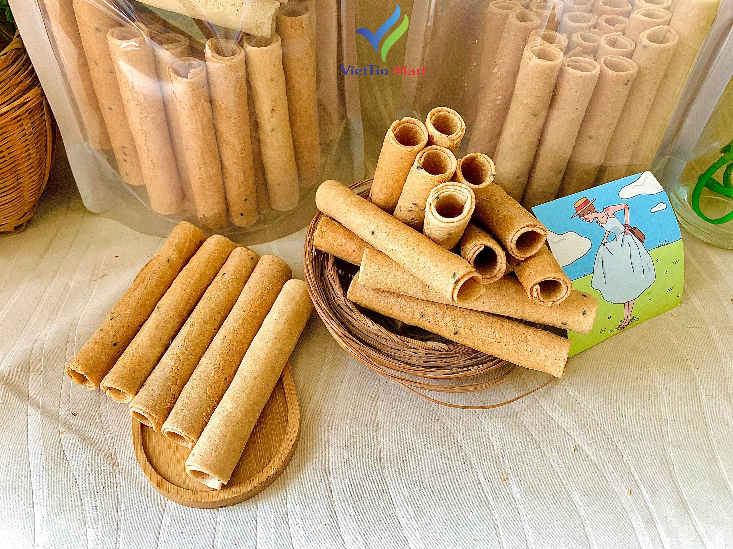 THÔNG TIN SẢN PHẨM Tên sản phẩm: 500g bánh ống mè đen Thành Phần: đường, trứng, và bột gạo, mè đen Thương hiệu: VIETTIN MART Khối lượng : 500g Quy cách đóng gói : Sản