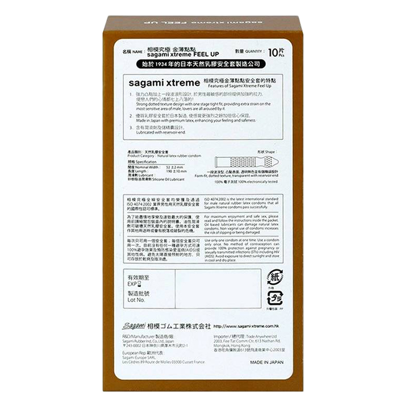 - Bao cao su Sagami Feel Up là dòng sản phẩm có gai nhỏ - chấm nổi, một lần thắt, nhiều chất bôi trơn của Sagami – Nhà sản xuất bao cao su đầu tiên tại Nhật Bản. TÍNH NĂNG SẢN PHẨM Sagami gai