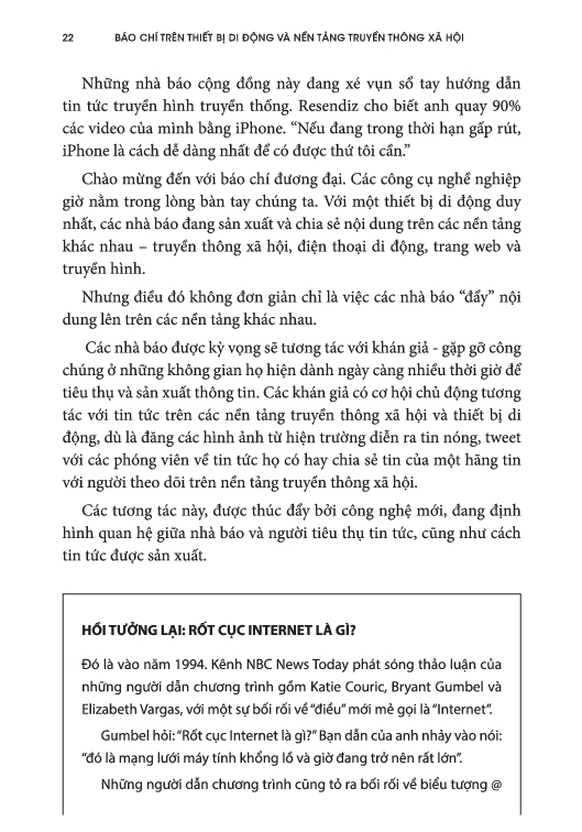 Kết hợp lý thuyết và thực hành, cuốn sách bao gồm các danh sách kiểm tra và các hoạt động thực tế trong mỗi chương, cho phép người đọc xây dựng ngay các kỹ năng truyền thông xã hội và di động mà các nhà báo ngày nay cần và các tổ chức tin tức mong đợi. Phiên bản thứ hai vẫn tập trung vào các giá trị cốt lõi của báo chí, chẳng hạn như xác thực, xác minh và độ tin cậy, đồng thời hướng dẫn người đọc cách áp dụng chúng vào các hoạt động truyền thông kỹ thuật số. Cuốn sách cũng đưa ra một cuộc thảo luận chuyên sâu về vai trò tích cực của khán giả trong việc sản xuất nội dung, cách thiết bị di động và mạng xã hội đã thay đổi cách khán giả tiếp nhận tin tức cũng như ý nghĩa của những thay đổi này đối với các nhà báo.