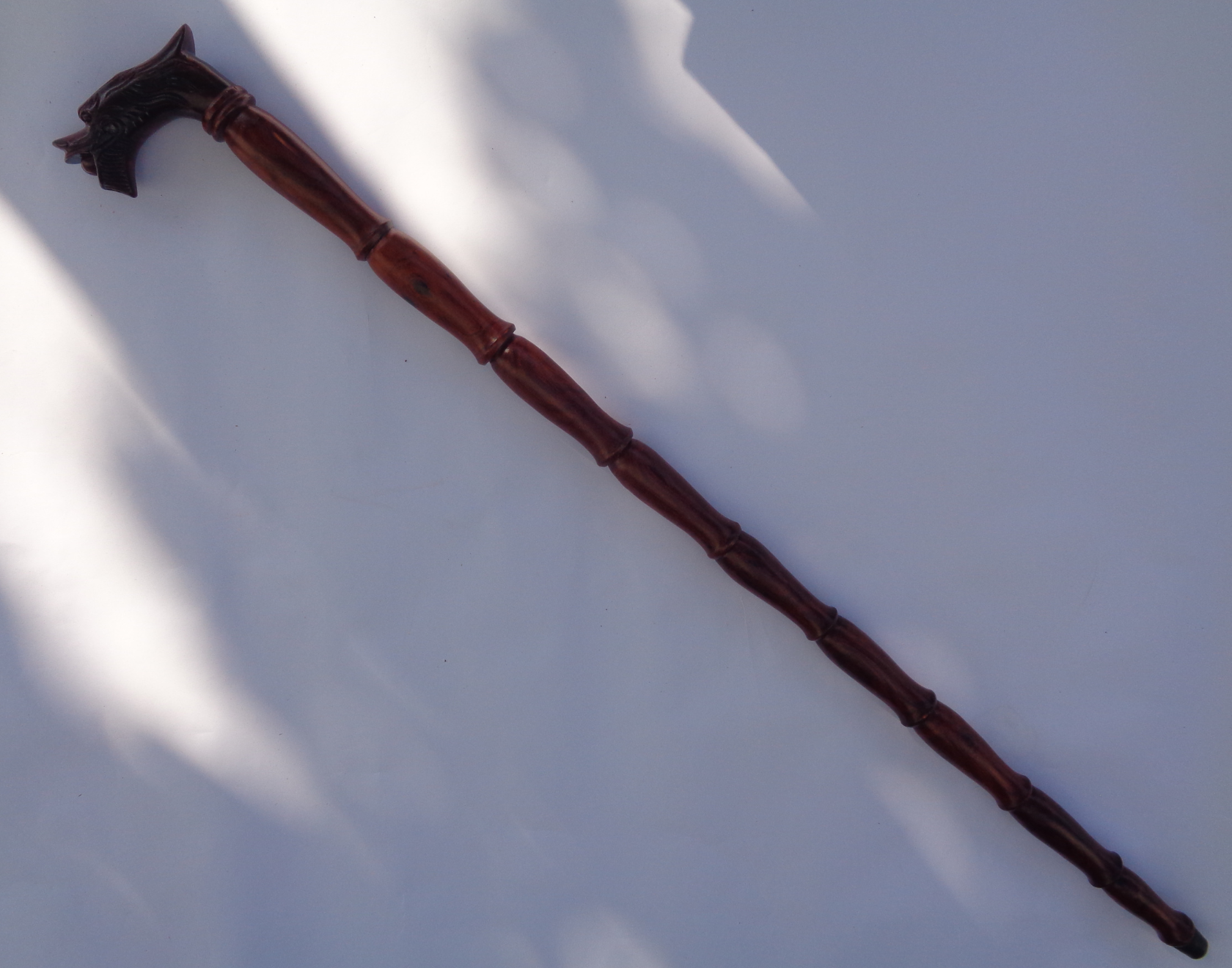 Hình Dáng: Sản phẩm có thiết kế đầu gậy hình rồng và tay cầm cong, phần cong giúp cầm nắm dễ dàng. Chất liệu là gỗ trắc 100%, từ đầu đến đế chân gậy đều nhẵn bóng. Màu sắc đen xọc đỏ và lớp phủ PU cao cấp tạo nên vẻ đẹp và sang trọng.