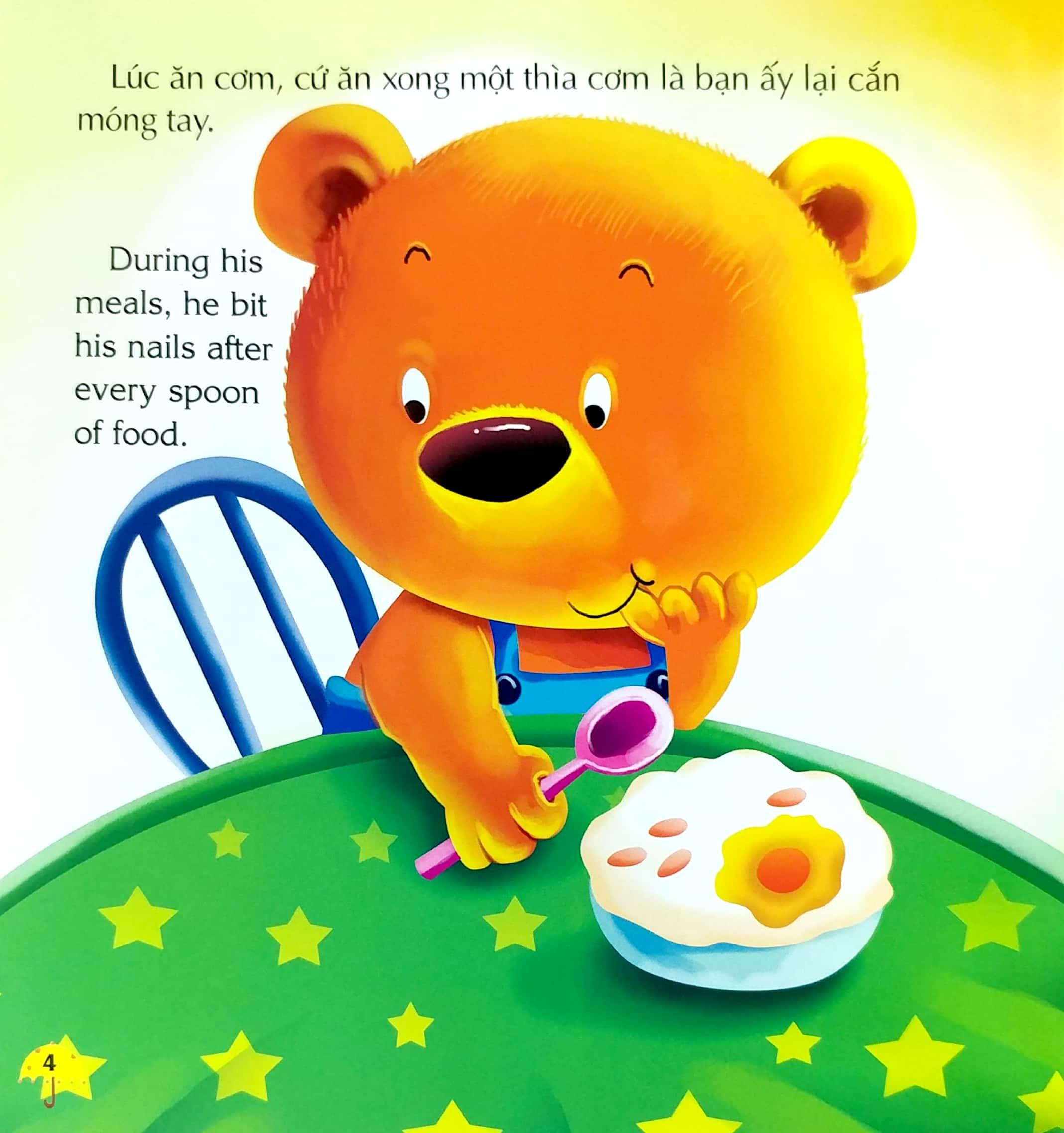 Nhưng đó là một việc rất mất vệ sinh và có hại cho sức khỏe đấy. Vì muốn Gấu con luôn được khỏe mạnh, Gấu mẹ đã nghĩ ra một cách để giúp Gấu con từ bỏ thói quen xấu ấy. Bé có đoán được đó là cách gì không nào? Bé hãy mở cuốn sách này ra để theo dõi câu chuyện của Gấu con và cùng Gấu con học cách yêu thương bản thân nhé!