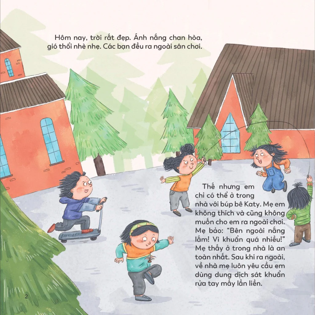- Mẹ của Gia Hân không thích và cũng không muốn cho em ra ngoài chơi. Mẹ bảo: “Bên ngoài nắng lắm! Vi khuẩn quá nhiều!” Mẹ thấy ở trong nhà là an toàn nhất. Nhưng Gia Hân cũng muốn ra ngoài chơi với búp bê Katy thân yêu, liệu có cách nào không nhỉ? Mời bạn khám phá trong cuốn sách này nhé! Trích đoạn Ưu điểm Nội dung gần gũi, dễ hiểu: Cuốn sách sử dụng ngôn ngữ đơn giản, hình ảnh minh họa sinh động, dễ dàng thu hút sự chú ý của trẻ. Qua câu chuyện của nhân vật Gia Hân, bé sẽ hiểu được tầm quan trọng của việc tăng cường sức đề kháng để có thể thoải mái vui chơi. Kiến thức khoa học, chính xác: Thông tin trong sách được trình bày một cách khoa học, dễ hiểu, giúp trẻ hiểu rõ về hệ miễn dịch, các yếu tố ảnh hưởng đến sức khỏe và các cách để tăng cường sức đề kháng. Thực hành ngay tại nhà: Cuốn sách không chỉ cung cấp kiến thức lý thuyết mà còn đưa ra những gợi ý thực hành cụ thể như chế độ ăn uống lành mạnh, luyện tập thể dục, nghỉ ngơi hợp lý.