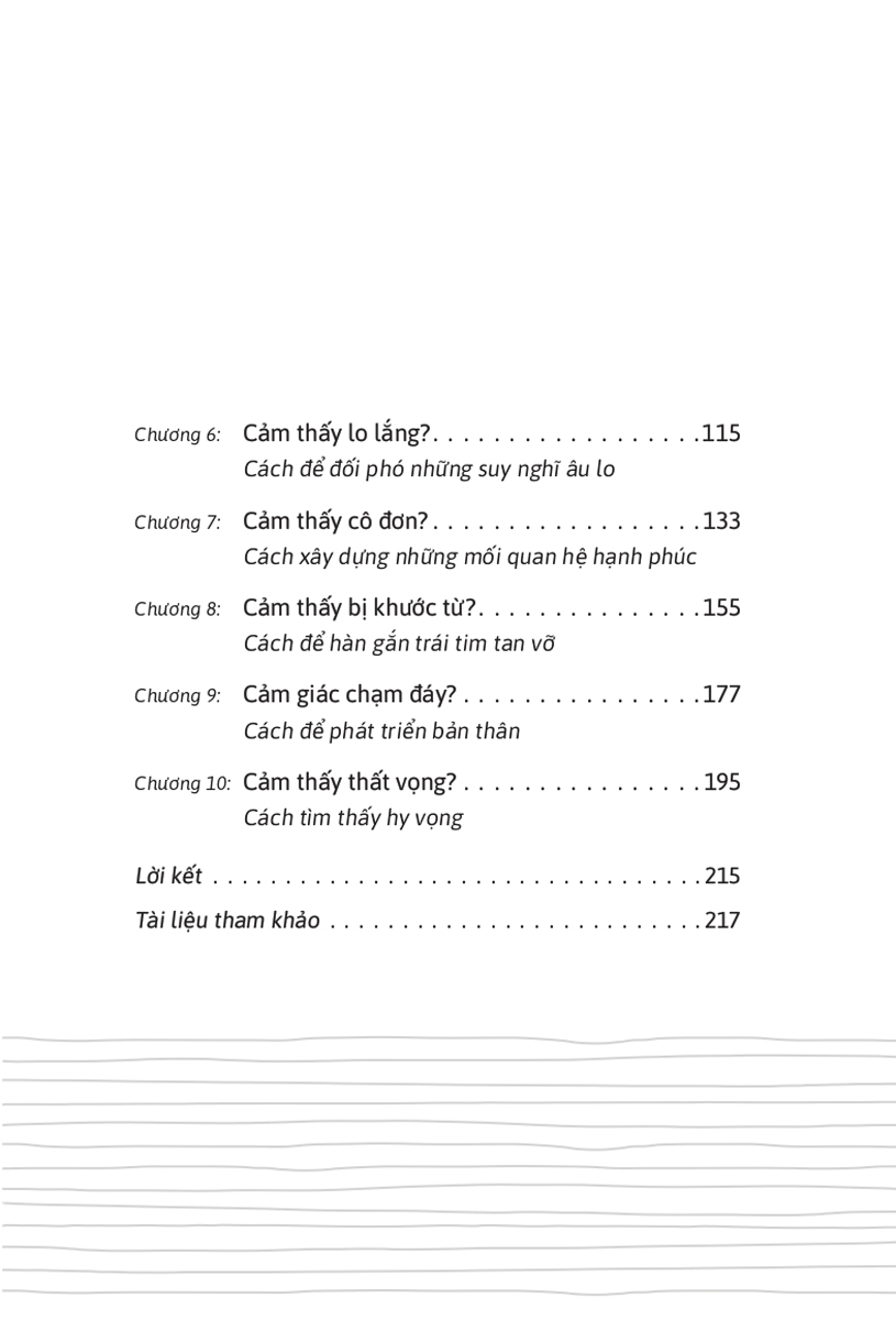 Bí Kíp Chống Tụt Mood Bạn đối phó với những tâm trạng ngổn ngang như thế nào?     Ngày nay, chắc chắn ai trong chúng ta cũng phải đối mặt với rất nhiều những áp lực và căng thẳng. Đó có thể là công việc, học tập, chuyện bè bạn, gia đì Dù cho ở độ tuổi nào thì cũng ta cũng sẽ gặp phải đôi lần có những cảm xúc buồn rầu hay tâm trạng “down mood”. Ngoài ra, tâm trạng khi những chuyện không vui xảy xảy ra cũng đóng vai trò cực kỳ quan trọng đối với chất lượng cuộc sống.     Vì vậy, chúng ta cần phải hiểu rõ cảm xúc của bản thân và học cách quản lý cảm xúc để điều chỉnh cũng như cân bằng chúng, làm bạn với chúng, chứ không phải là loại bỏ hoàn toàn, khống chế hay kìm hãm.     Quản lý cảm xúc, ngoài giúp ta hiểu rõ bản thân và giải quyết những xung đột nội tâm, còn có thể giúp ta hiểu và mến thương hơn những người xung quanh mình. Và để học được cách kiểm soát cảm xúc và tâm trạng sẽ giúp chúng ta vượt qua khó khăn. Nếu bạn đang cần cải thiện tâm trạng, hãy đọc ngay quyển sách Bí Kíp Chống Tụt Mood.     Quyển sách này bao gồm “trọn gói” các chiến lược khoa học giúp bạn xử trí và cải thiện những vấn đề cốt yếu trong cuộc sống: lối tư duy, đời sống xã hội, công việc và những khó khăn riêng trong đời sống cá nhân. Dựa trên công việc nghiên cứu cũng như những lần trao đổi với mọi người tại các buổi hội thảo, tác giả đã tạo nên một bộ các chiến lược giúp đương đầu và vượt qua các kiểu tâm trạng tồi tệ mà chúng ta có thể thực hành bất cứ lúc nào và ở bất cứ đâu để trở nên lạc quan hơn, quyết đoán hơn và tự tin hơn.     Cải thiện tâm trạng cùng Bí Kíp Chống Tụt Mood     Sau khi đọc và áp dụng các bí quyết trong sách, bạn sẽ cảm thấy bản thân mình trở nên thư thái hơn – bạn sẽ tìm thấy sức mạnh của sự tĩnh lặng bên trong bạn. Cuộc sống hằng ngày dường như trở nên dễ dàng hơn, bởi chính bạn dần dần sẽ bước vào giai đoạn chuyển hóa. Hãy xem quyển sách này như một toa thuốc, với một vài loại thuốc dùng lúc khẩn cấp và các loại khác được chia thành các liều nhỏ để sử dụng hằng ngày. Các chương của quyển sách khá ngắn và chỉ mất tầm 20 phút để đọc; và khi cơn hoảng loạn ập đến, bạn chỉ cần tập trung vào lời khuyên khẩn cấp ở đầu chương – không quá 2 phút đọc đâu. Hãy thực hành theo những lời khuyên này khi bế tắc hay chỉ đơn giản là khi bạn không vui và muốn cải thiện tâm trạng. Mỗi chương sẽ xử lý một loại tâm trạng tiêu cực khác nhau để bạn có thể đào sâu tìm hiểu khi cần cũng như có thể đi thẳng đến “liều thuốc” bạn cần lúc khẩn cấp.     Quyển sách sẽ giúp bạn “đánh tan” 10 kiểu tâm trạng tiêu cực sau:     ◆ Thiếu quyết đoán     ◆ Mất động lực     ◆ Mất kiểm soát     ◆ Căng thẳng     ◆ Quá tải     ◆ Lo lắng     ◆ Cô đơn     ◆ Cảm thấy bị khước từ     ◆ Cảm giác chạm đáy     ◆ Thất vọng   Mỗi chương The Instant Mood Fix: emergency remedies to beat anxiety, panic or stress được cấu trúc như sau:     Phần 1: Đọc khi khẩn cấp. Đây là phần đọc nhanh không quá 2 phút. Phần này sẽ giúp bạn ngay lập tức thoát khỏi giây phút khó khăn.     Phần 2: Một chút khoa học. Phần này sẽ mang đến các thông tin cơ bản về tâm lý học đằng sau một cảm xúc hay tâm trạng nào đó, cho bạn góc nhìn sâu hơn về những điều đang diễn ra ở cấp độ tâm lý học cũng như chúng ta có thể bị ảnh hưởng bởi các cảm xúc này như thế nào.     Phần 3: Đối phó thế nào? Phần này sẽ mang đến các chiến lược dài hạn để chuyển hóa một cảm xúc hay tâm trạng tiêu cực nào đó. Quyển sách sẽ giới thiệu với các bạn các kế hoạch phát triển nội tại để xây dựng sức bật, khả năng tự phục hồi cũng như khả năng đương đầu với khó khăn.   Cuối cùng, hãy “thưởng thức” Bí Kíp Chống Tụt Mood như một ly cafe sáng để giúp bạn nâng cao tinh thần mỗi ngày nhé!