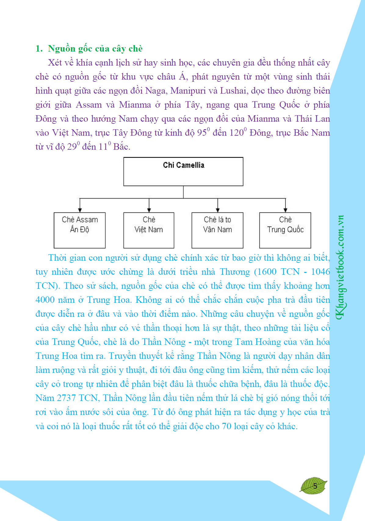 Hiện nay phần đông các nhà bác học thế giới đã thống nhất là quê hương xa xưa của cây chè không phải nằm gọn trong một nước, mà là cả một vùng rộng lớn bao gồm phía nam Trung Quốc (tỉnh Vân Nam), vùng phía bắc Miến Điện, vòng sang tỉnh At-sam và cả phía bắc Việt Nam.